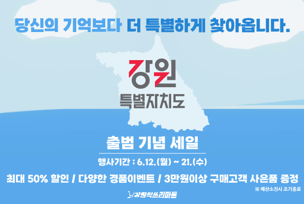 강원특별자치도는 출범기념을 맞이하여 6. 12.(월) ~ 21.(수)까지 도내산 우수 농특산물 특판행사를 농수특산물진품센터 강남점인 강원싹쓰리마트에서 진행한다.