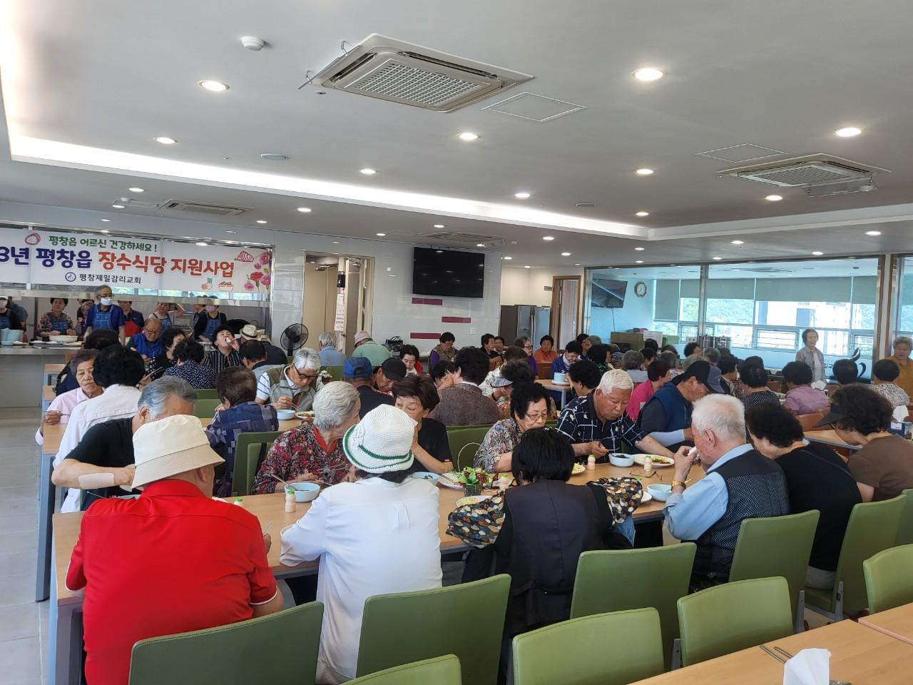 지난(6.17.) 11:30, 평창제일감리교회(목사 진광호)는 장수식당을 운영하고 관내 어르신 100명을 대상으로 식사제공을 하여 따뜻한 온정을 나누었음.