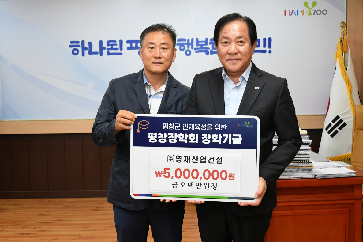 21일, ㈜영재산업건설(대표 김영국)은 지역 인재육성을 위한 평창장학회 장학기금 500만원을 기탁 했다.