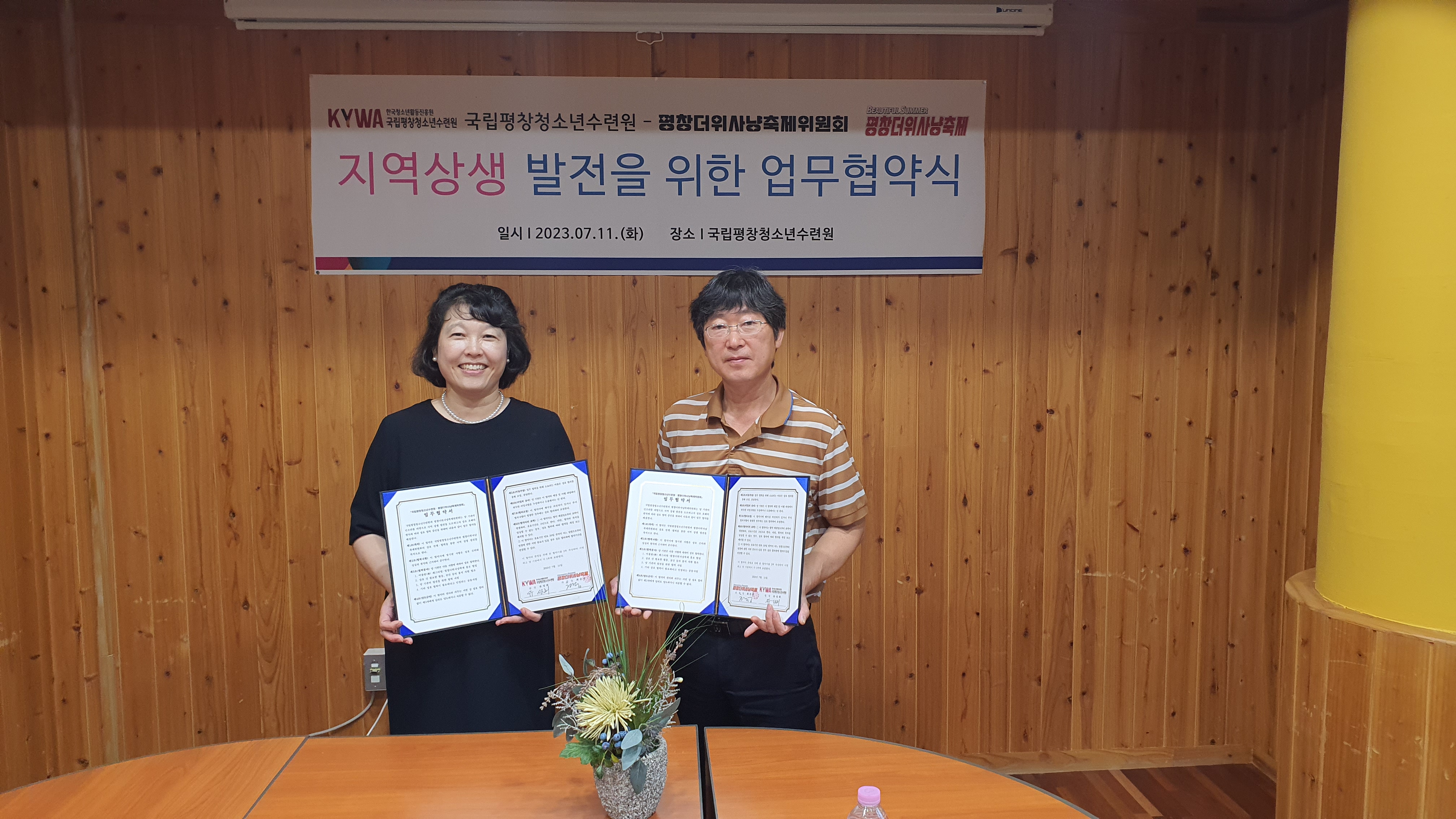 평창더위사냥축제위원회(위원장 최돈중)와 국립평창청소년수련원(수련원장 유성희)은 지난 12일, 지역 상생 발전을 위한 업무협약을 맺었다. 앞으로 국립평창청소년수련원과 평창더위사냥축제위원회(위원장 최돈중)는 인적, 물적 자원의 협조로 양기관의 발전에 힘을 보탤 계획이다. 평창군의 대표적인 여름 축제인 평창더위사냥축제와 국립평창청소년수련원의 협업으로 인해 23년 평창군의 여름이 더욱 풍성해 질 것으로 기대되고 있다.
