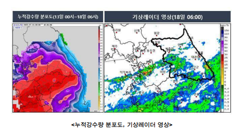 또한, 비가 매우 강하게 내리는 지역뿐만 아니라 관련 수계지역(하류 포함)에서도 추가적인 재해가 발생할 가능성이 높 으므로 위험 지역에서는 상황 판단 후 안전을 위해 이웃과 함께 신속한 대피 및 피난하는 등 즉시 안전조치를 시행하기 바란다. 한편, 좁은 지역에 매우 강한 비가 내리면서 지역에 따라 강수 강도와 강수량의 차이가 크겠고, 강약을 반복하면서 소강 상태를 보이는 곳도 있겠으니, 최신 기상정보와 레이더 영상을 참고해야 한다.