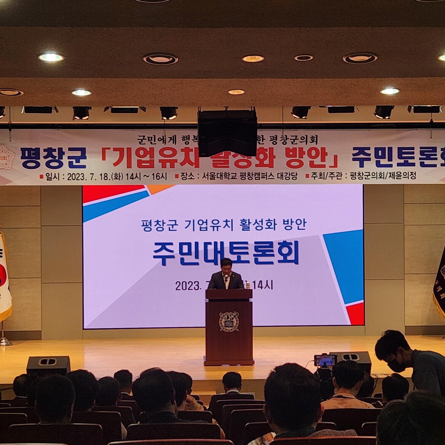 평창군의회는 오늘(18일) 14시 서울대학교 평창캠퍼스 대강당에서 ‘평창군 기업유치 활성화 방안 주민대토론회’를 개최했다.