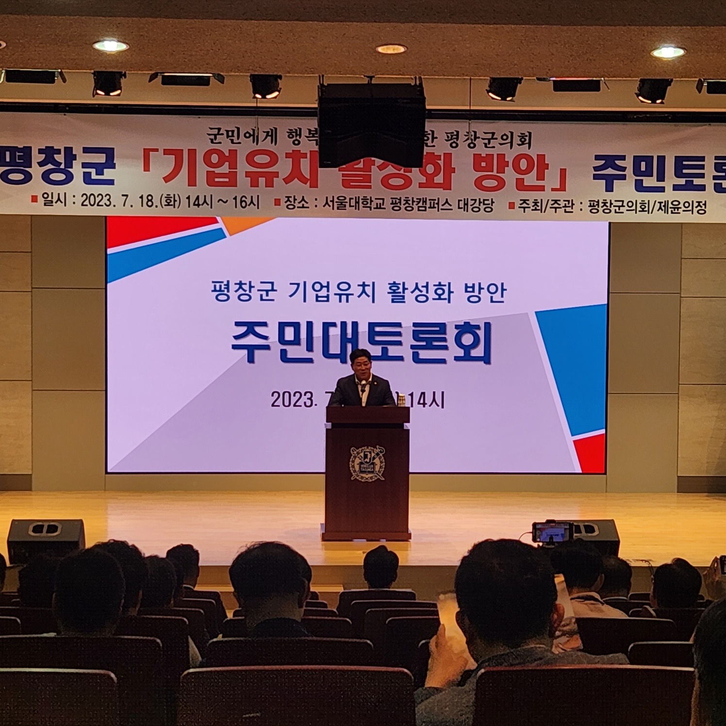 평창군의회는 오늘(18) 14시 서울대학교 평창캠퍼스 대강당에서 평창군 기업유치 활성화 방안 주민대토론회를 개최했다.