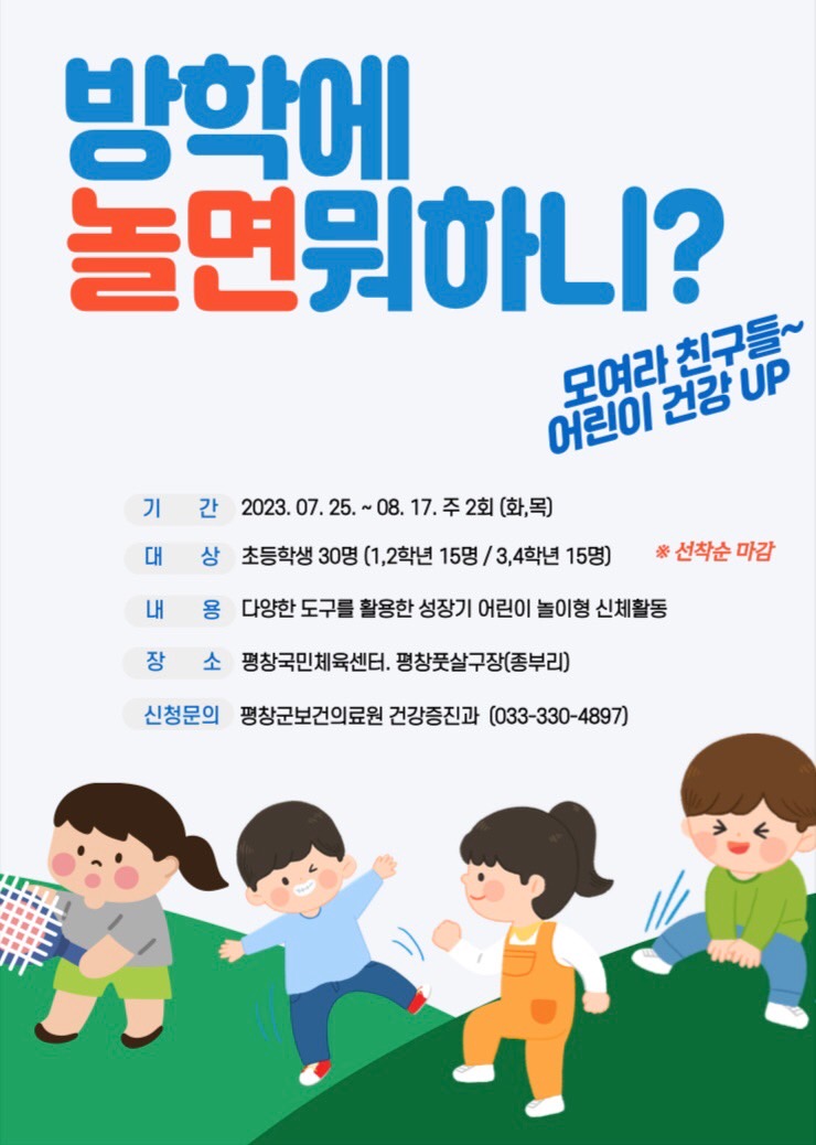 평창군보건의료원은 여름방학을 이용하여, 성장기 어린이를 대상으로 운동습관 형성 및 비만예방을 위한 놀이형 신체활동 프로그램을 운영한다고 밝혔다.