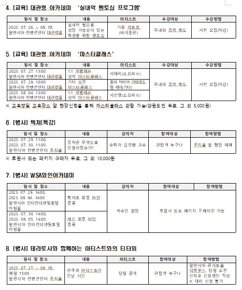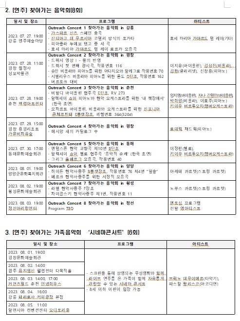 제20회 평창대관령음악제에서는 우크라이나 전쟁으로 현재 피난 상황에 처해있는 ‘키이우 비르투오지(Kyiv Virtuosi) 스트링 오케스트라’ 초청 공연이 예정되어 있으며, 이 외에도 총 20회의 콘서트, 8회의 찾아가는 음악회와 대관령아카데미 및 올해 새롭게 선보이는 찾아가는 가족음악회 등이 8월 5일까지 평창 일원에서 펼쳐진다. 자세한 사항은 평창대관령음악제 홈페이지(mpyc.kr)에서 확인하거나 운영실(033-240-1364)로 문의하면 된다.