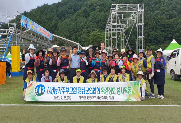 (7.25), (사)농가주부모임 평창군연합회(대화분회장 윤복선) 회원 30여 명은 7. 28.부터 진행되는 2023 평창더위사냥축제 방문객에게 깨끗한 환경 제공을 위해 축제장 일원에서 환경정화 활동을 실시했다.