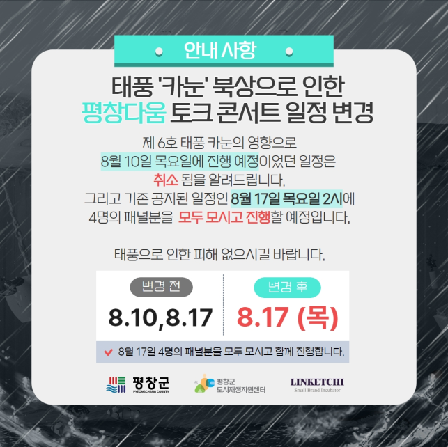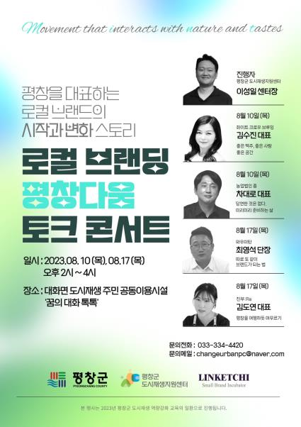 ‘로컬 브랜딩 평창다움, 토크 콘서트’행사가 평창군 대화면 도시재생 주민공동이용시설인‘꿈의 대화 톡톡’에서 17일(목) 개최된다. 본 행사는 2023년 평창군 도시재생 역량강화 교육의 일환으로 추진되며, 평창군이 주최하고 스몰브랜드 인큐베이팅 컴퍼니인 링케치가 주관, 평창군 도시재생지원센터가 지원한다.