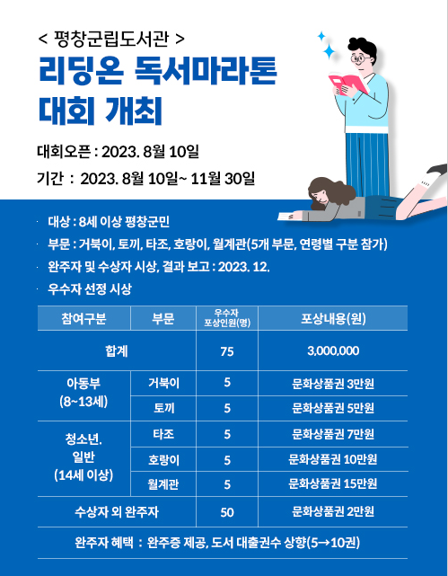 평창군은 2023810일부터 평창군민을 대상으로 리딩온 독서마라톤 대회를 개최한다.