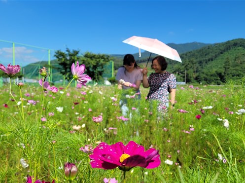 정성스럽게 가꾼 코스모스는 길었던 장마를 지나 무더위 속에서도 만개해 가을의 소식을 전하며, 방문객과 지역 주민들에게 무더위 속 힐링의 시간을 선사하고 있다.