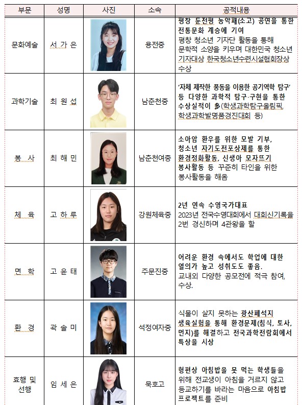 올해 수상자는 7개 분야에 7명으로 지난 418일부터 524일까지 도내 시장, 군수를 비롯하여 학교장, 청소년관련 기관 단체장의 추천을 받아 713일 강원특별자치도 청소년육성위원회에서 최종 선정됐다.