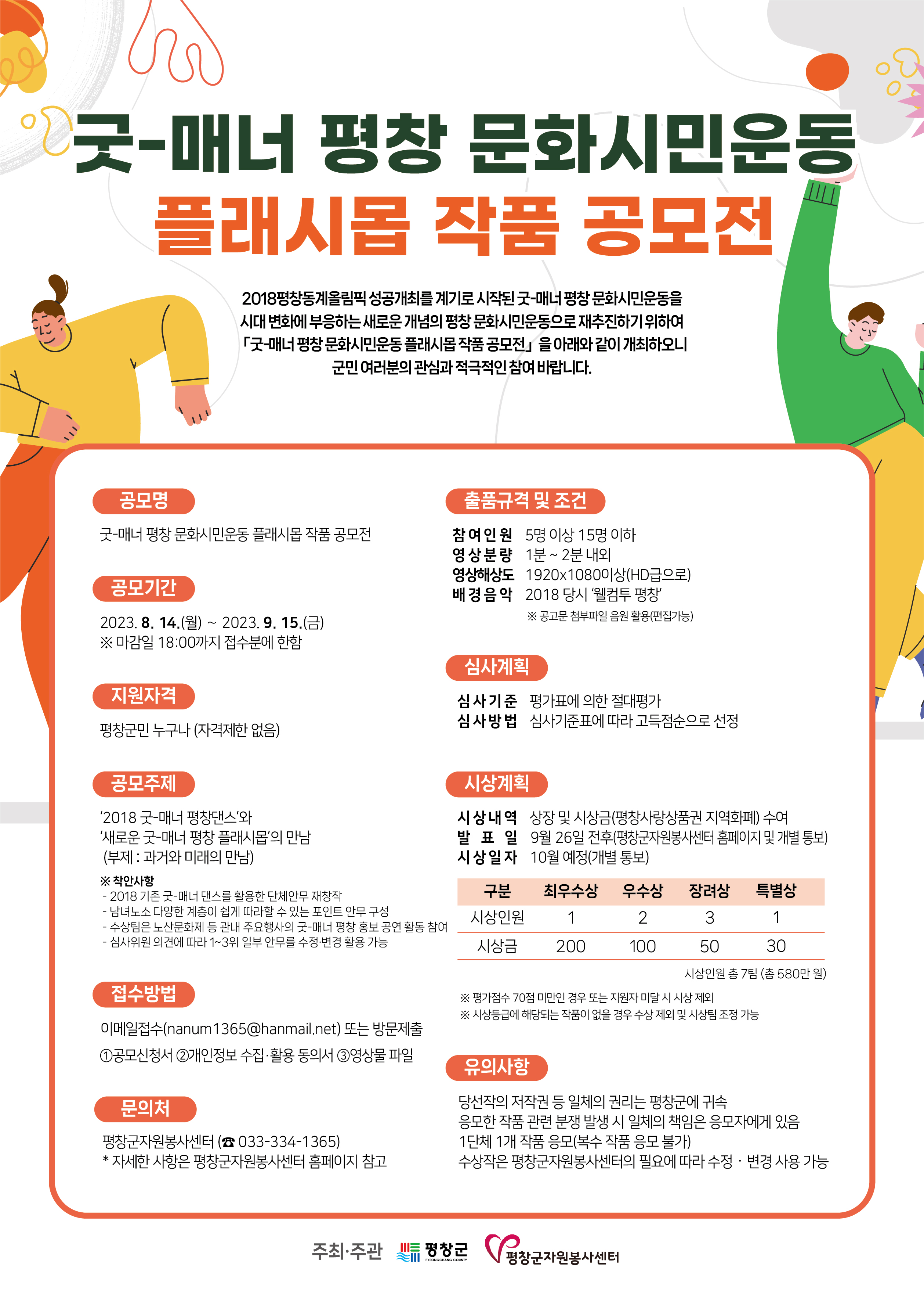 ‘2018 굿매너 평창댄스’와 ‘새로운 굿매너 평창 플래시몹’의 만남을 공모 주제로 남녀노소 누구나 쉽게 따라 할 수 있는 포인트 안무를 1분 안팎의 영상으로 제작해 평창군자원봉사센터에 접수하면 된다.