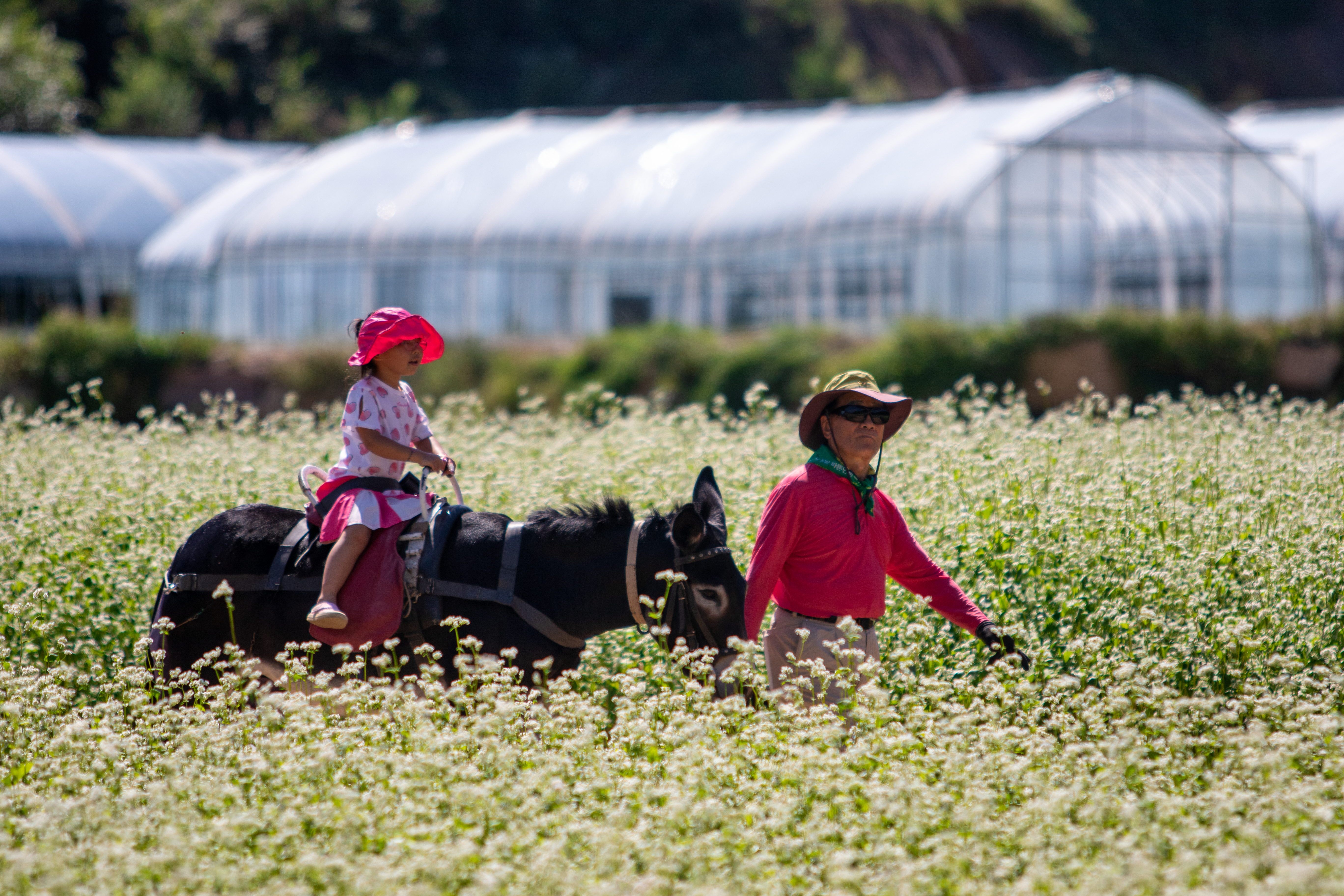 8일 오후 효석문화마을 일대에서 개막한 2023평창효석문화제를 찾은 어린이들이 나귀타기 체험을 즐기고 있다.