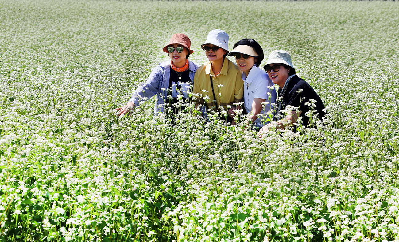 8일 오후 효석문화마을 일대에서 개막한 2023평창효석문화제를 찾은 방문객들이 메밀꽃밭에서 축제를 즐기고 있다.
