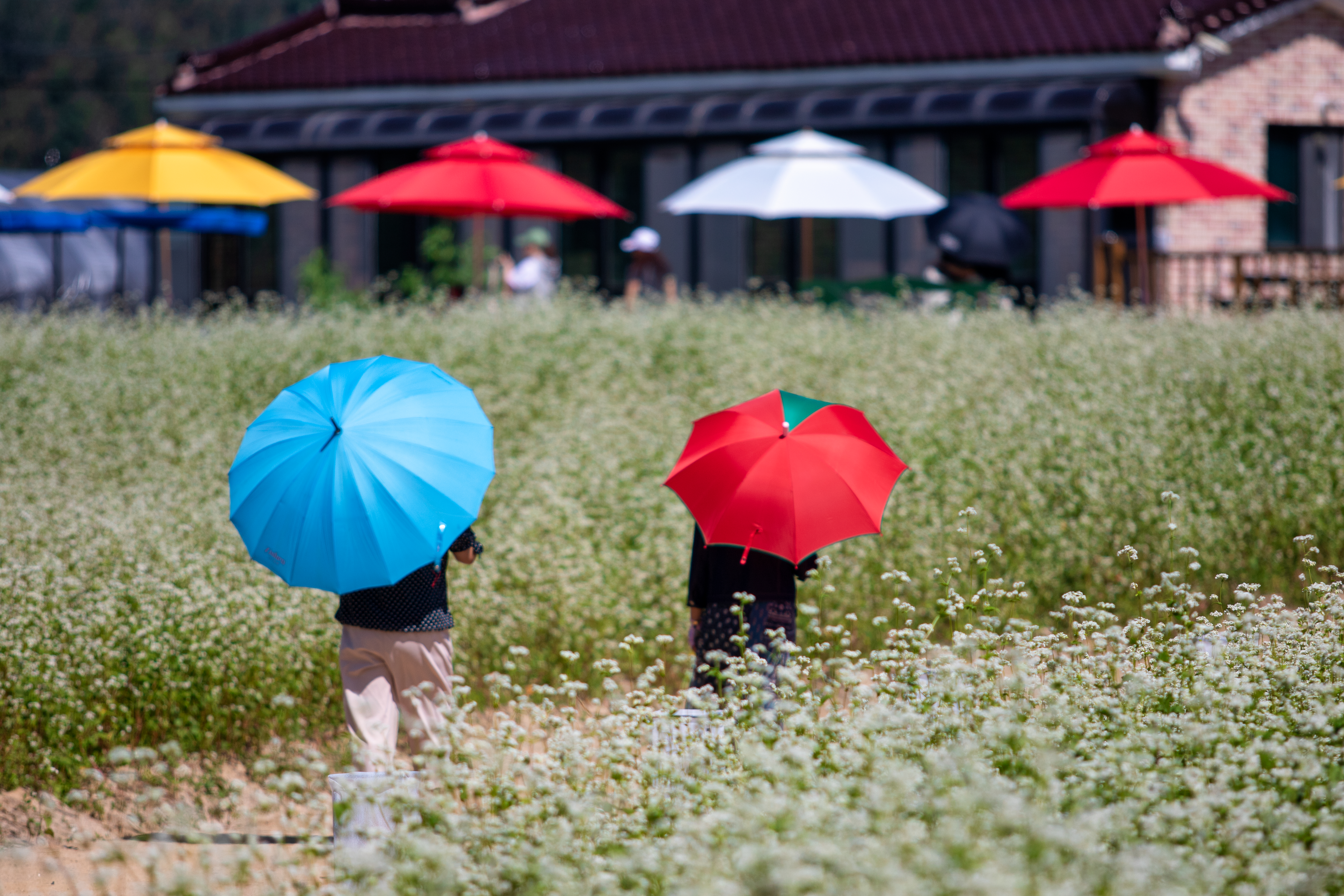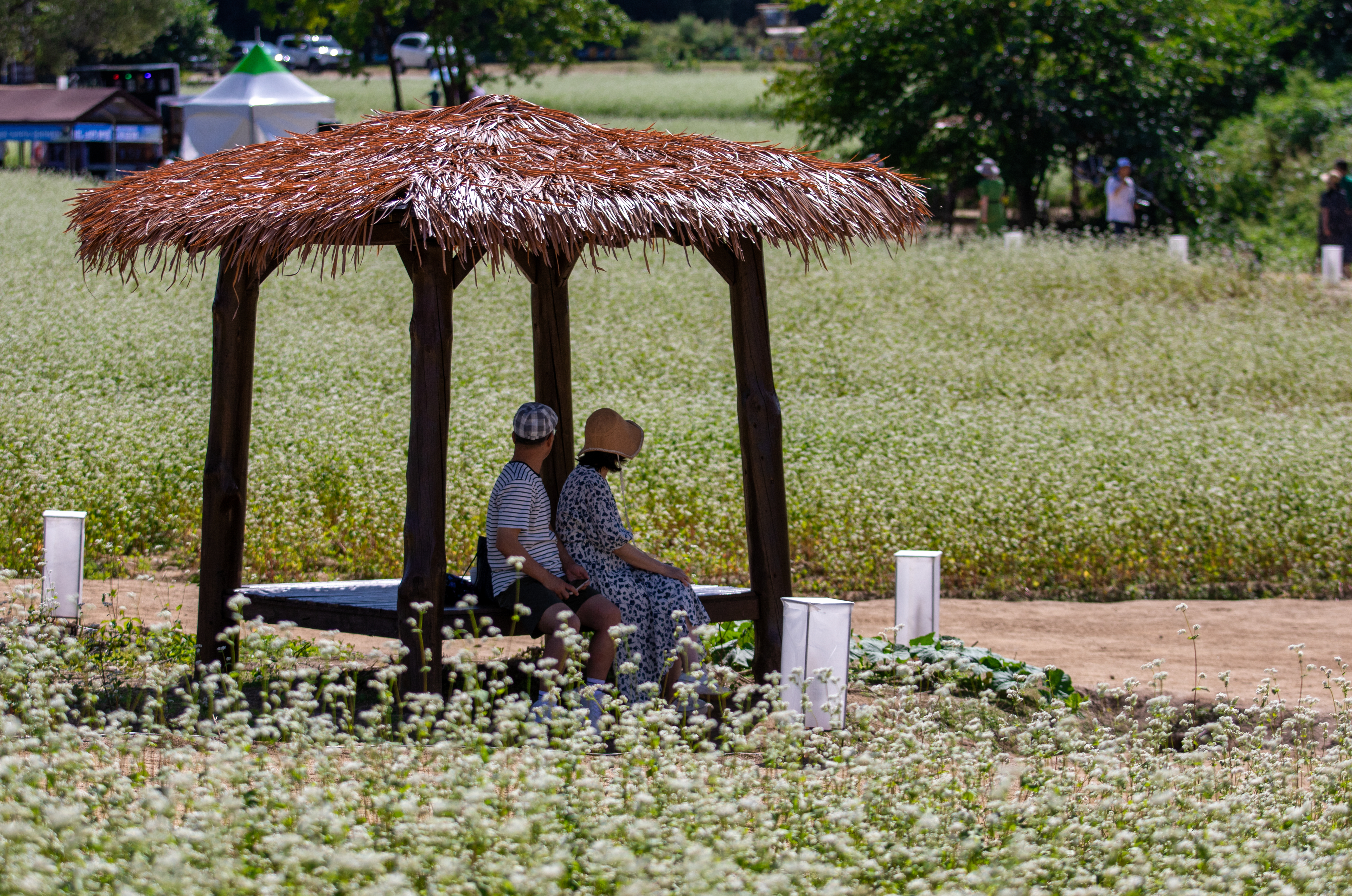8일 오후 효석문화마을 일대에서 개막한 2023평창효석문화제를 찾은 방문객들이 메밀꽃밭에서 축제를 즐기고 있다.