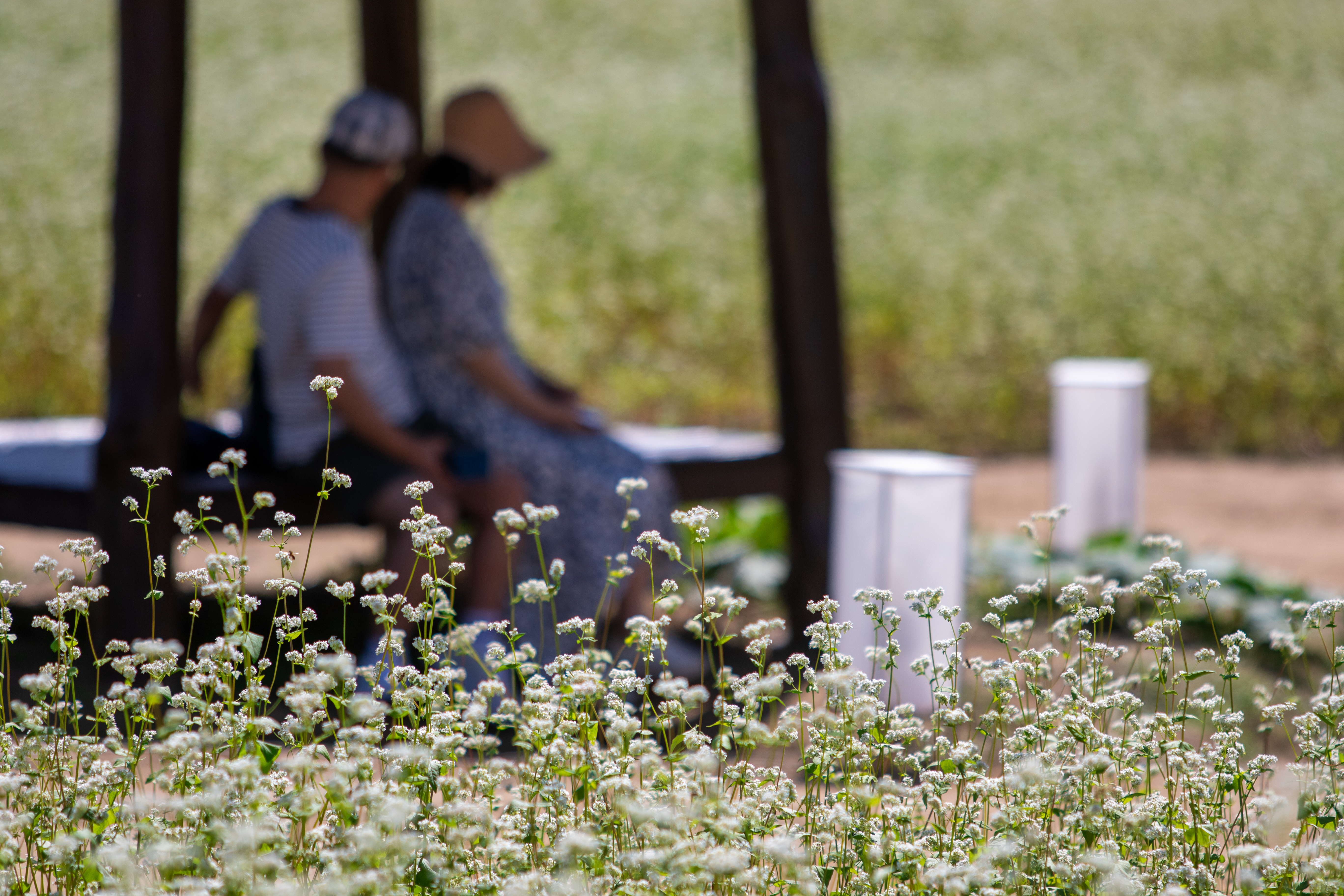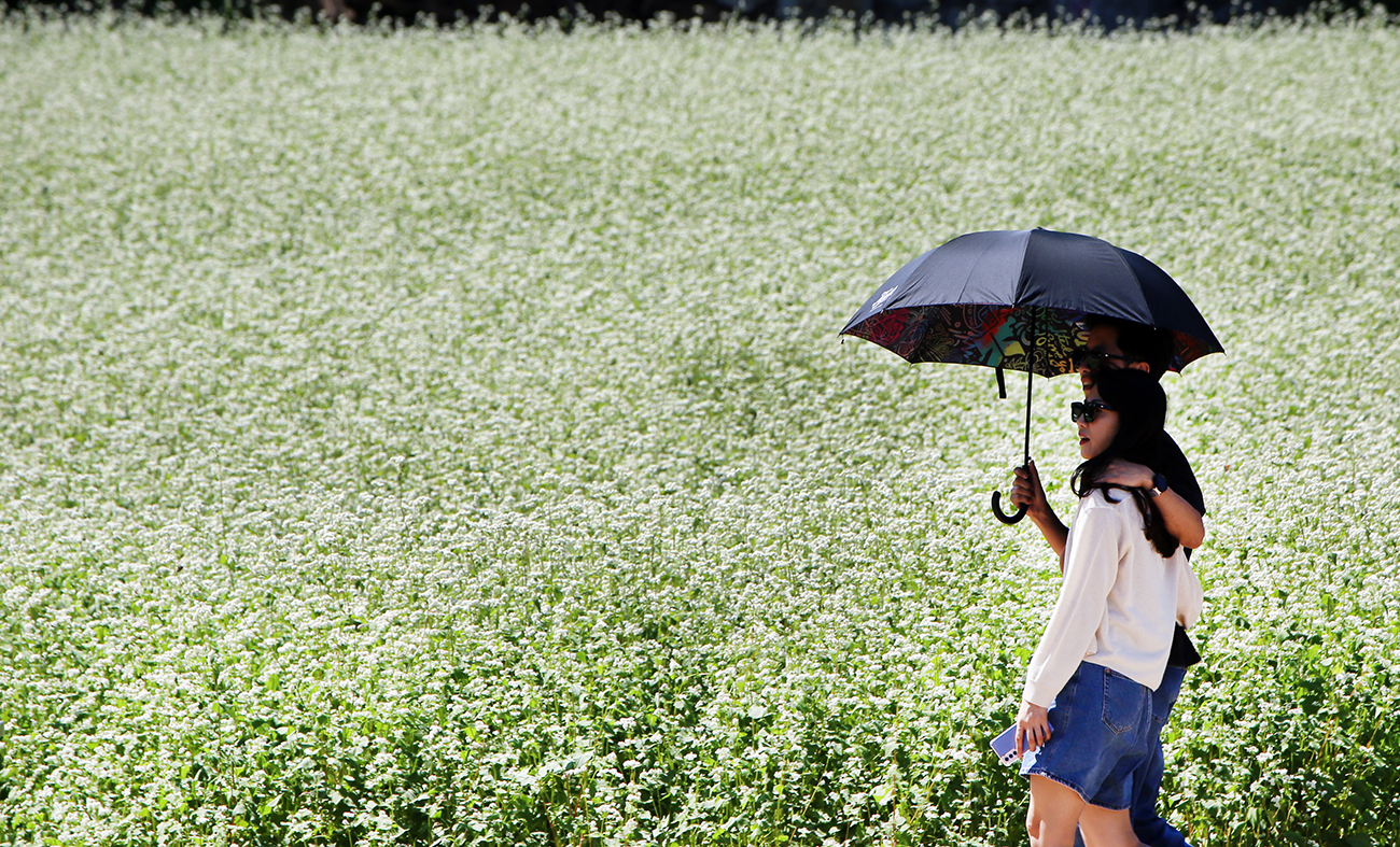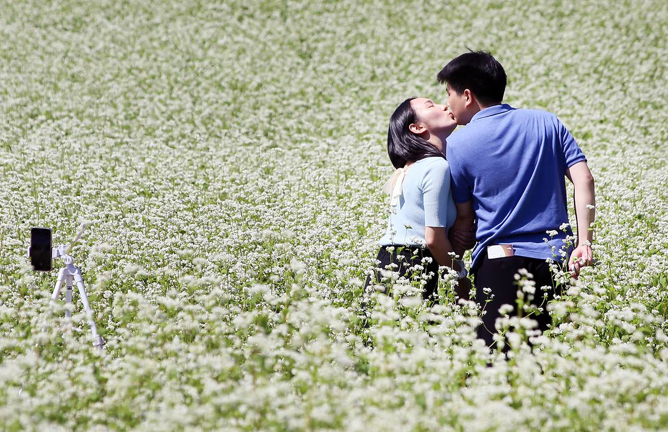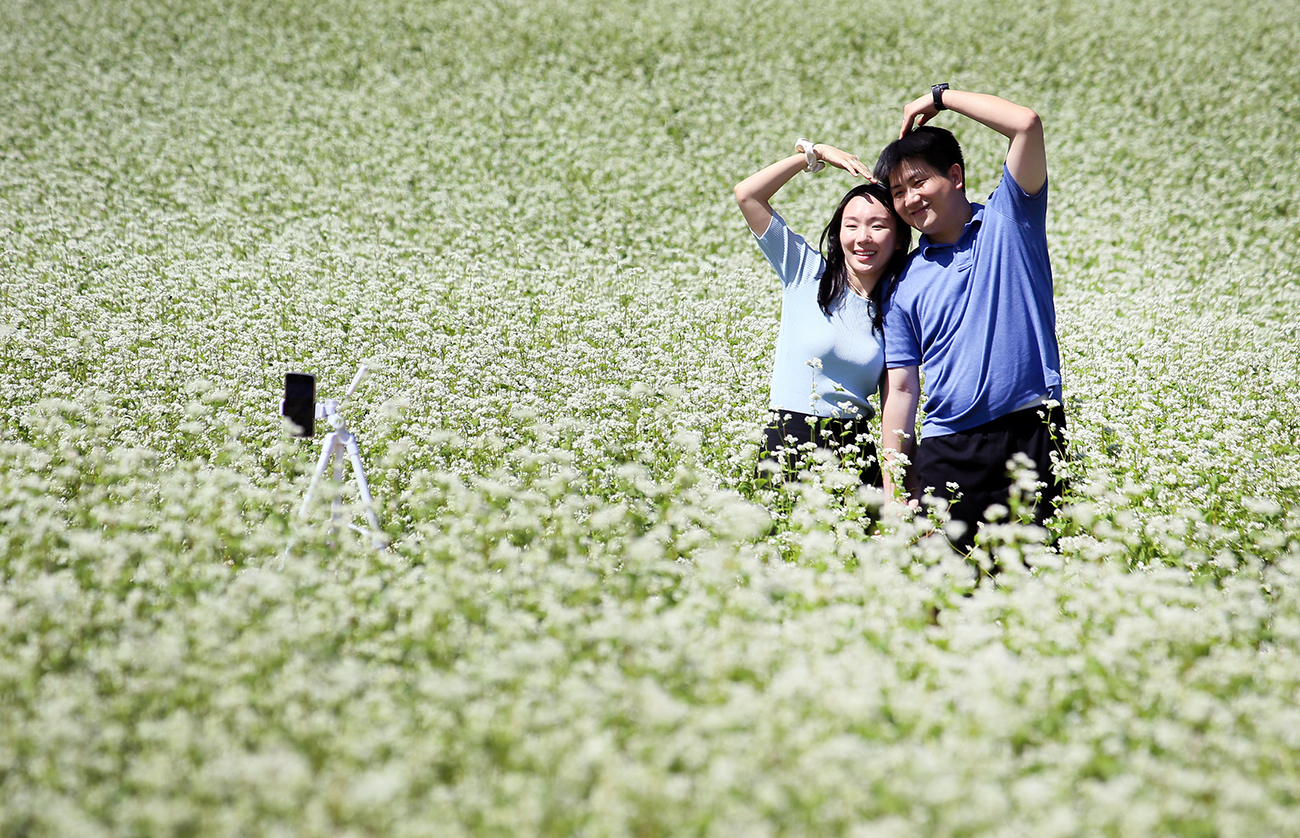 8일 오후 효석문화마을 일대에서 개막한 2023평창효석문화제를 찾은 신혼부부가 메밀꽃밭에서 자신들만의 추억을 남기고 있다.