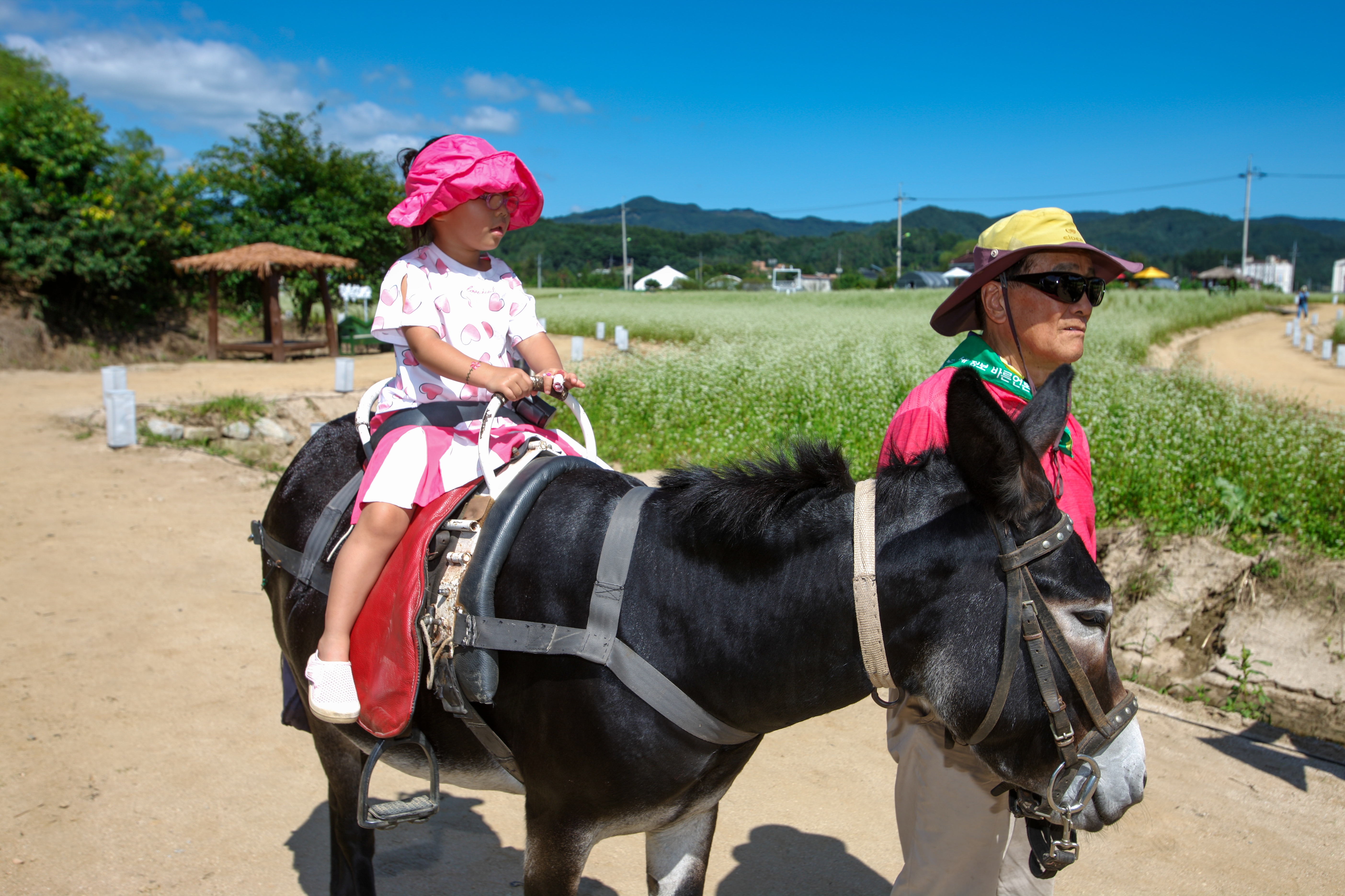 8일 오후 효석문화마을 일대에서 개막한 2023평창효석문화제를 찾은 어린이들이 나귀타기 체험을 즐기고 있다.