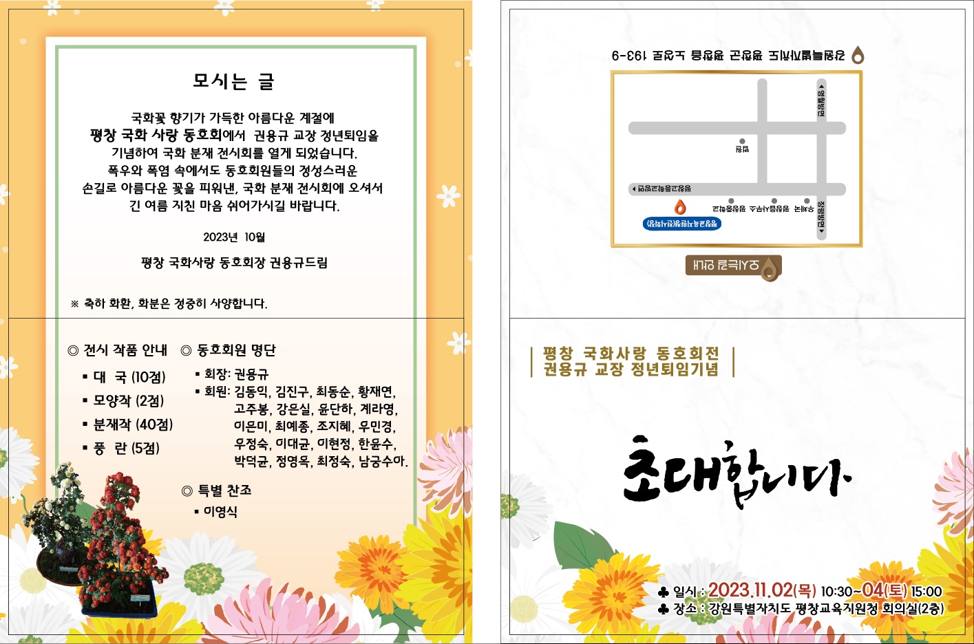 이번 전시회는 2023년 평창교육지원청에서 운영하는 직장동호회 활동의 결과물을 공유하기 위한 것으로 동호회 회원들이 2023년 4월부터 재배하며 만든 대국 10점, 모양작 2점, 분재작 40점, 풍란 5점 등 60여점이 전시될 예정이다.
