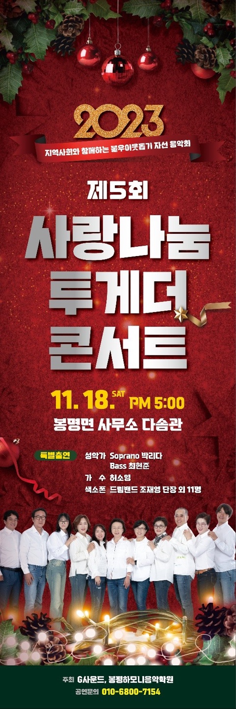그동안 매회 적극적으로 후원하여 주신 주민 여러분들 덕분에 올해에도 어김없이 오는 11월 18일 오후 5시 봉평면 사무소 다솜관에서 제5회 사랑나눔 콘서트를 개최 하게 되었습니다.
