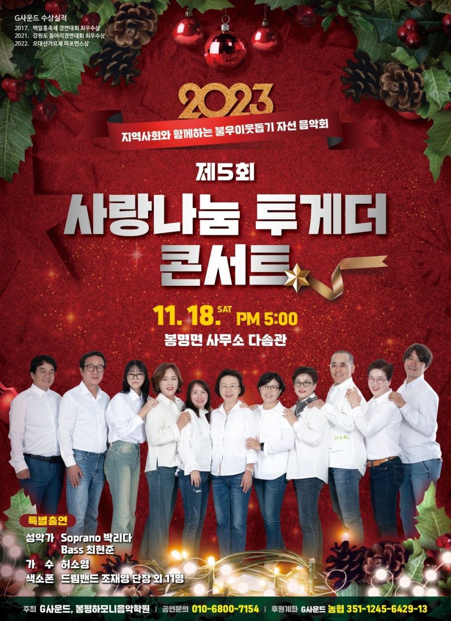 그동안 매회 적극적으로 후원하여 주신 주민 여러분들 덕분에 올해에도 어김없이 오는 11월 18일 오후 5시 봉평면 사무소 다솜관에서 제5회 사랑나눔 콘서트를 개최 하게 되었습니다.
