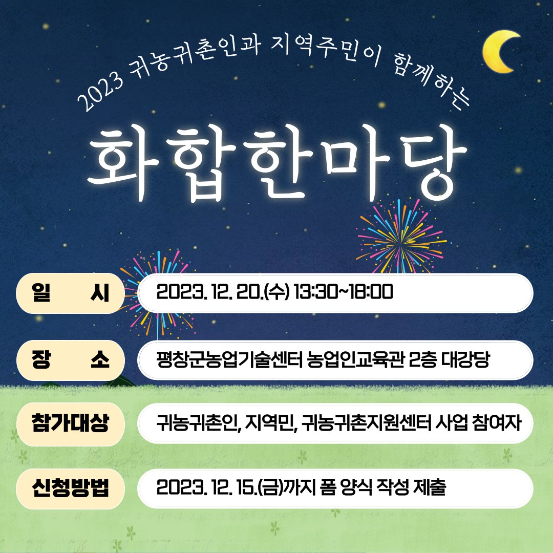 우리군에 새롭게 정착하는 귀농귀촌인이 지역주민과 상생융합하여 안정으로 정착할 수 있도록 소통과 화합의 장 마련하고자 귀농귀촌인과 지역주민이 함께하는 ‘화합한마당’을 개최하오니 많은 참여 바랍니다.