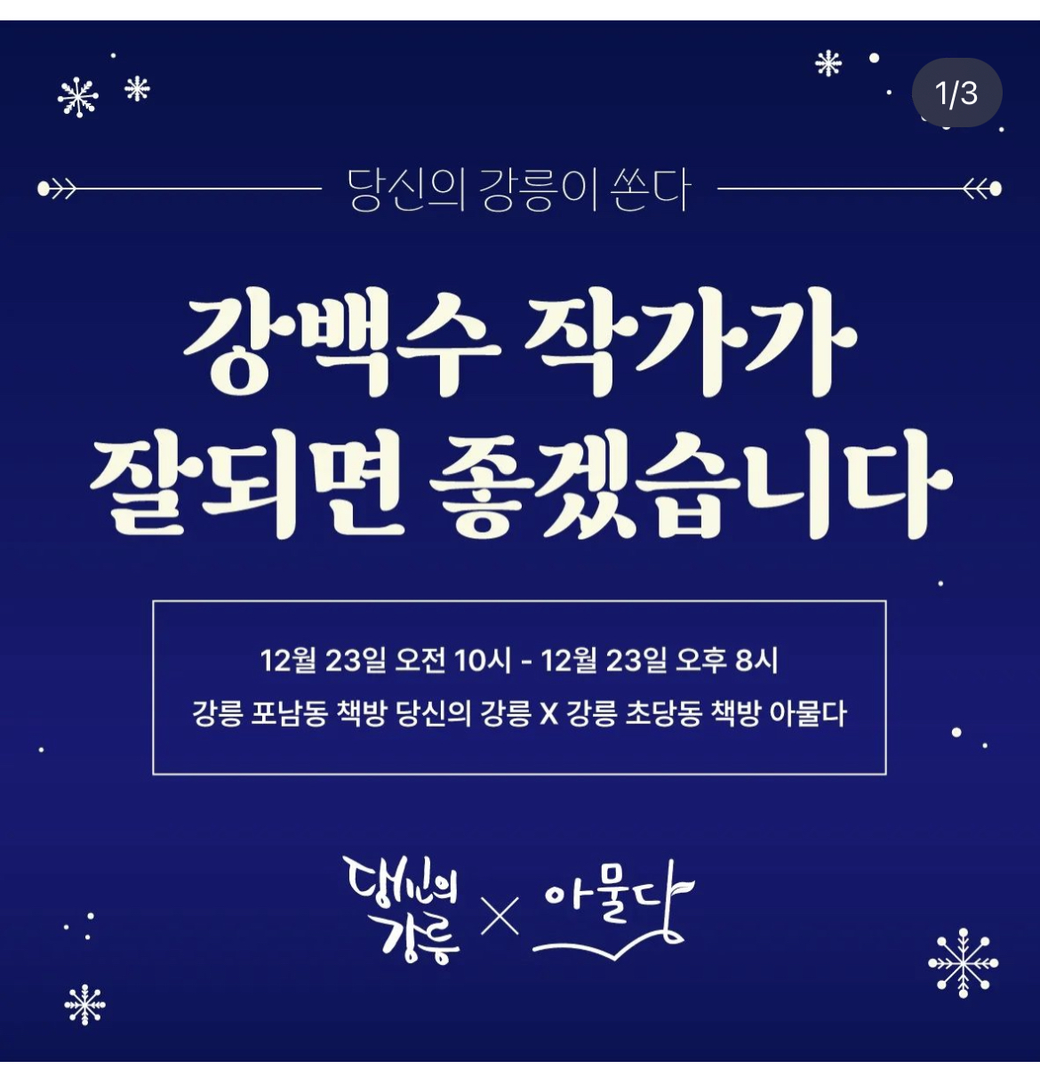 따뜻한 마음으로 선한 나눔을 실천하는 책방 ‘당신의 강릉’ , 책방 ‘아물다’ , 강백수(시인, 가수)님 모두 잘되면 좋겠습니다.