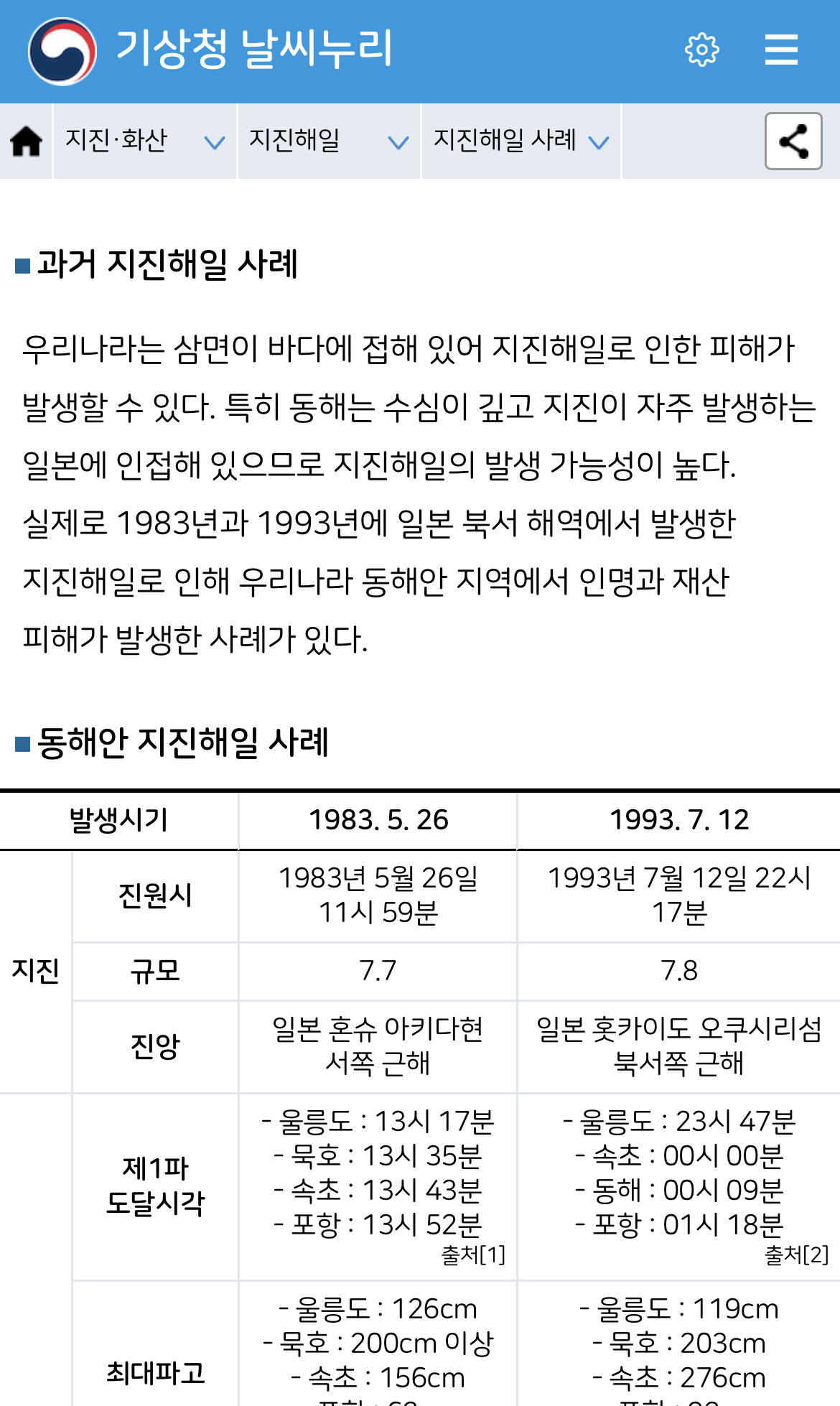 지진해일 사례 - 기상청 날씨누리