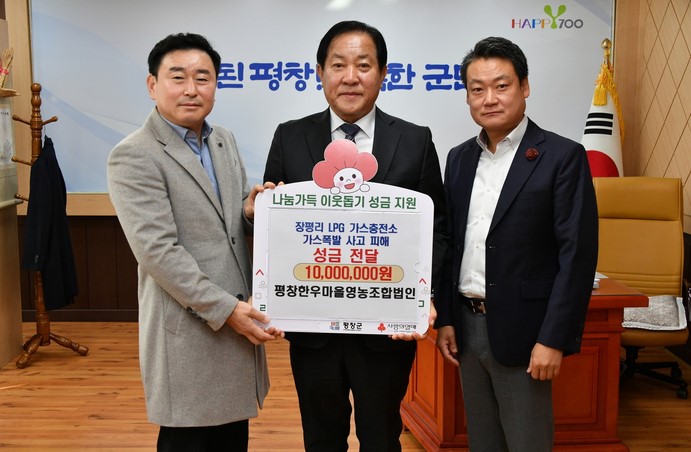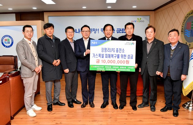 9일, 농협중앙회평창군지부와 군관내 7개 농축협에서 ‘용평면 장평리 LPG가스충전소 가스폭발사고’피해 이웃들에게 전달해 달라며, 성금 1,000만 원을 기탁했다고 밝혔다. NH농협 평창군지부 김태윤 지부장은“작은 보탬이지만 피해 주민들에게 힘이 되어주고 싶어 이번 성금을 전하게 됐다.”라고 말했다.
