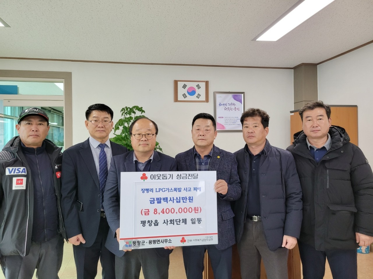 평창읍 김두기 읍장, 김종수 평창읍번영회장 등 평창읍 사회단체는 장평리 LPG 가스폭발 이재민을 위로하고 피해복구를 돕고자 용평면사무소에 성금을 기탁했다. 총 17개 사회단체가 따뜻한 손길을 건넸으며, 성금 금액은 840만원 이다.