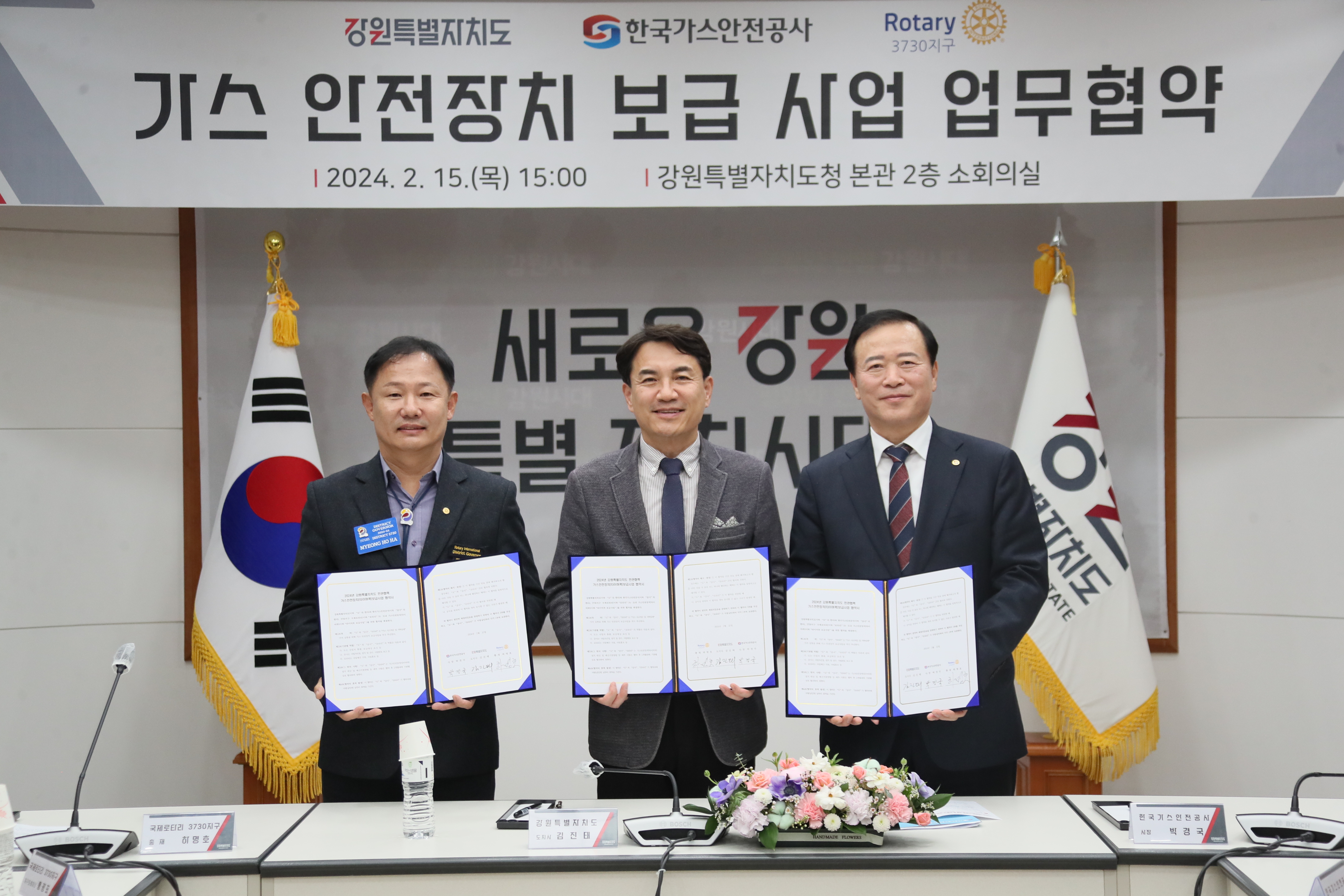 김진태 강원특별자치도지사가 2월 15일(목) 오후 세시 도청 본관2층 소회의실에서 취약계층의 안전복지 실현과 가스사고 예방을 위해 가스 안전장치 타이머콕 보급지원 업무협약을 맺었다.