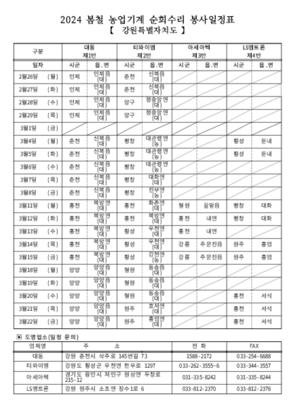 • 2월 26일 인제군을 시작으로 3월 22일 홍천군까지 4주간 10개 시. 군을 순회하며 농기계 점검•수리를 지원한다.