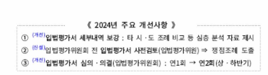 이를 위해, 자체 입법평가를 실시하는 총괄부서인 의회 입법정책담 당관실의 관련 조직을 2024년 1월 1일자로 확대(2팀-+3팀)하였으며, 전문 인력 보강 및 분석 강화로 입법평가의 완성도 제고를 위해 박 차를 가할 준비를 마쳤다.