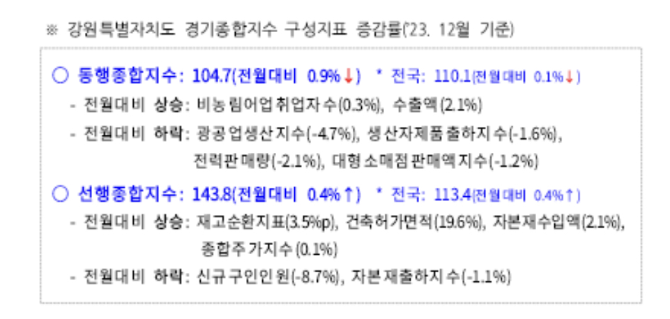 이번 발표자료(23. 12월 기준)에 따르면, 강원특별자치도 농행 종합지수는 전월대비 0.9% 하락하였으나 선행종합지수는 0.4% 상승한 것으로 나타났다.