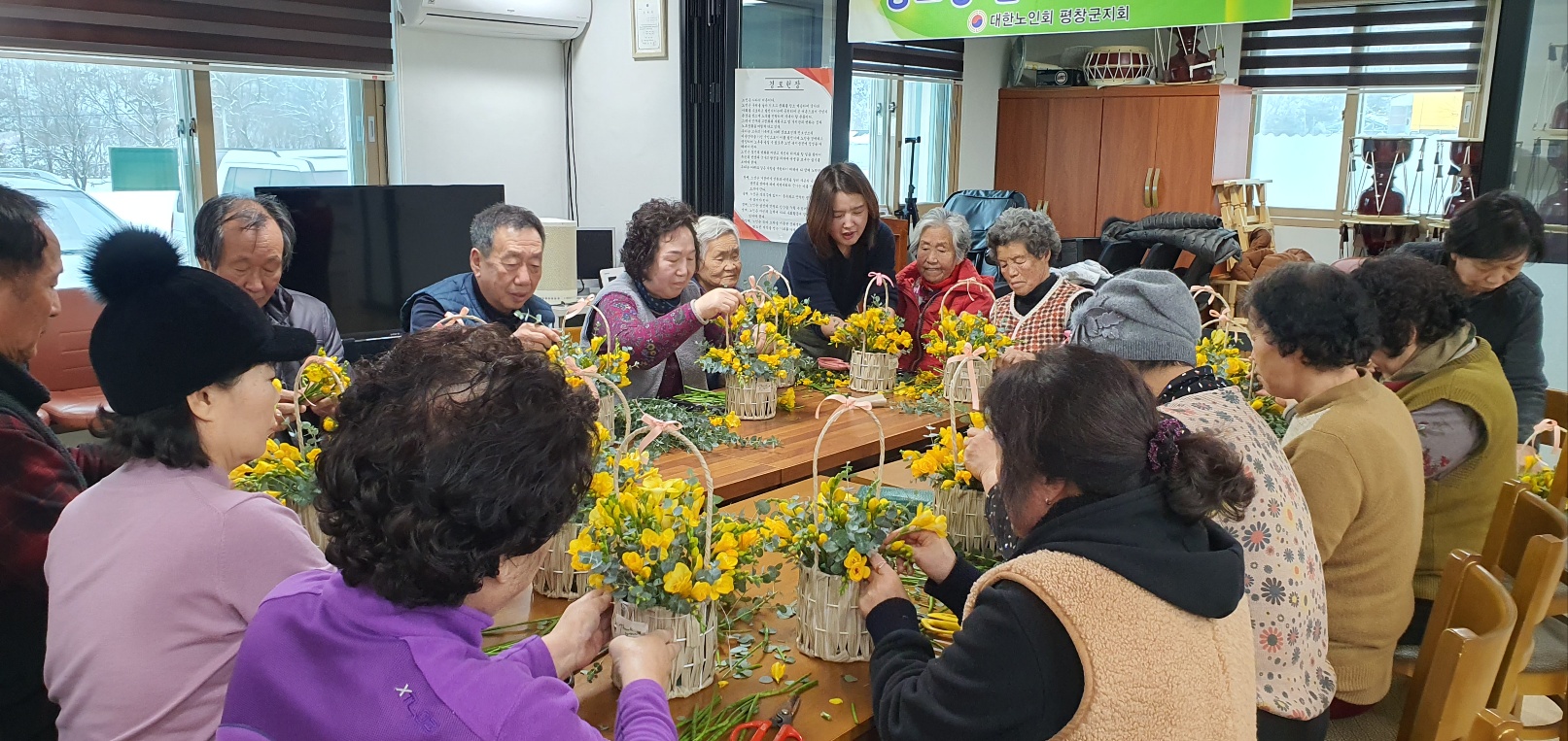 4회차의 치매예방교실을 마치고 현재는 원예 심리치료 프로그램을 진행하고 있다. 세상에 단 하나밖에 없는 나만의 꽃바구니를 만들면서 꽃의 향기와 아름다움에 봄의 정취를 미리 느끼는 시간을 보내고 있다. 보기에도 이쁘고, 향기도 좋은 꽃을 만지다 보면 저절로 미소 짓게 되며 손가락 운동을 통해 소근육 발달에도 도움이 되는 효과가 있다. 프로그램에 참여하고 있는 90세 어르신은 내가 만든 꽃을 선물로 받으니 젊은 시절 행복했던 시간도 떠오르고 꽃을 보니 걱정, 근심이 사라진다며 함박웃음을 지었다.