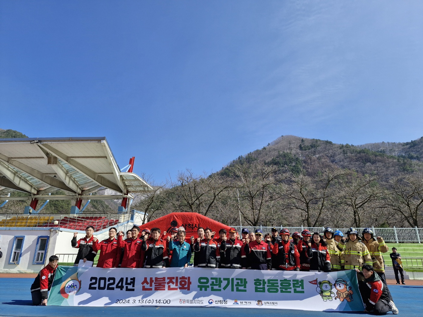 강원특별자치도는 3월 13일 삼척시 도계읍 공설운동장에서 봄철 산불 대응력을 강화하고 산불유관기관과의 유기적인 협업체계를 구축하기 위한 산불진화 합동훈련을 실시했다.