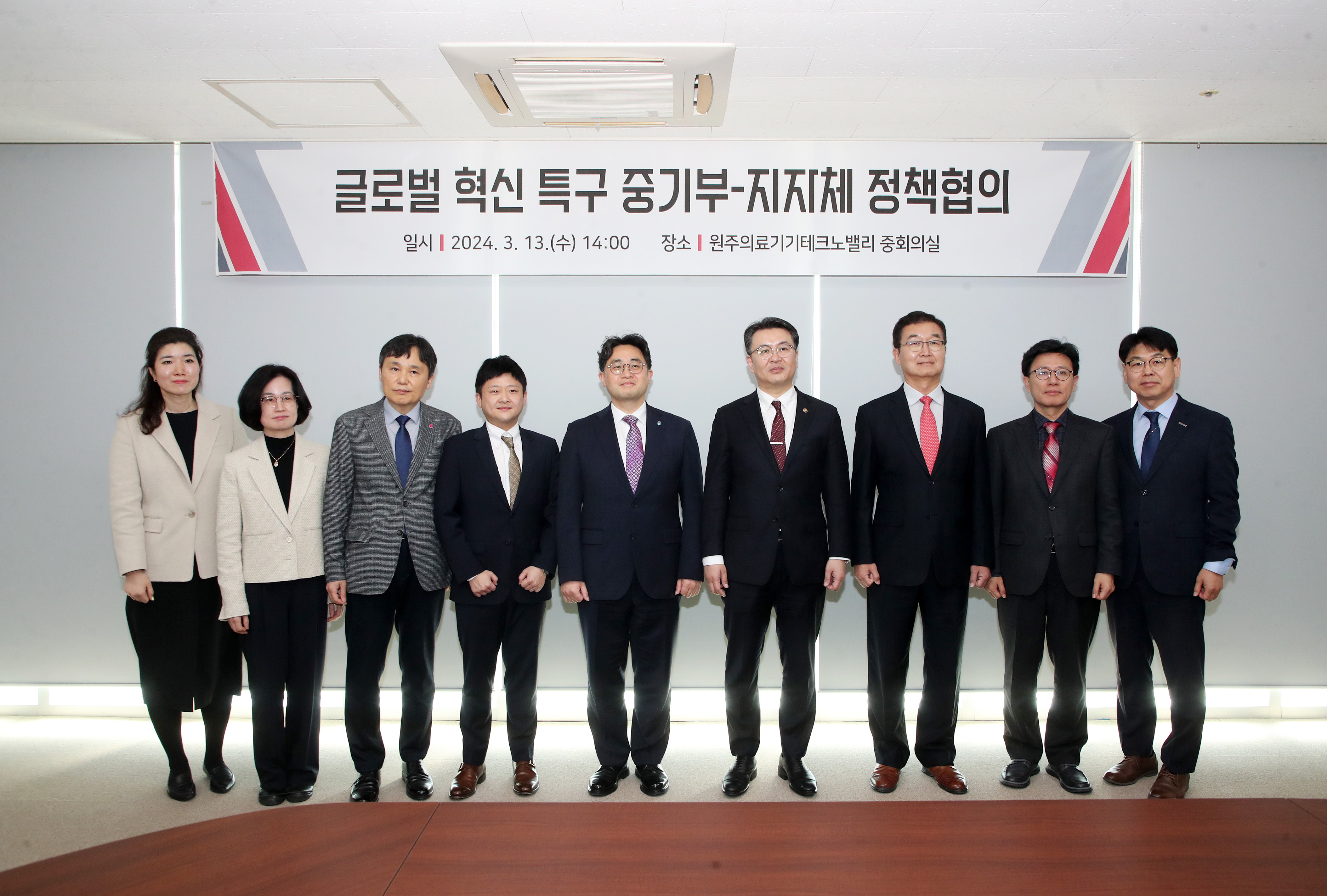 강원특별자치도는 3월 13일(수), 원주의료기기테크노밸리에서 글로벌 혁신 특구의 성과를 극대화하기 위한 중소벤처기업부-지방자치단체 정책협의회를 개최했다고 밝혔다.