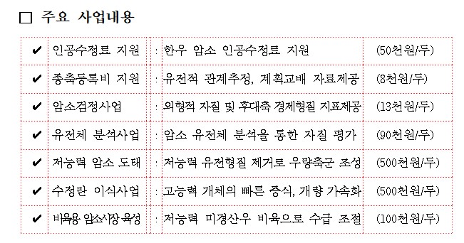 특히 한우 사육 과잉에 따른 가격 하락에 대응하여 한우 암소 유전체 분석 5,500두와 암소검정 16,000두를 통해 암소능력평가의 정확도를 향상시켜 우량 암소집단을 조성하고, 유전능력 하위 20% 저능력암소 500두를 도태하고 14개월령 이하 저능력 미경산우 4,200두에 난소결찰 시술비용을 지원하여 비육용 암소시장 육성하여 한우 수급조절을 조절하는 동시에 강원 한우의 전체적인 유전자 질을 향상시킨다.