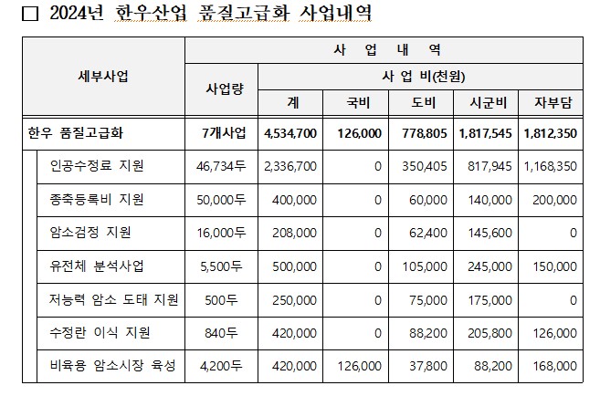 강원특별자치도는 사육두수 증가와 소비 둔화로 인한 한우가격 하락, 고물가로 인한 경영비 상승 등으로 어려움을 겪고 있는 한우농가의 경영 안정과 한우산업의 품질 경쟁력 향상을 위해 2024년 한우 품질고급화사업 7개 분야에 45억 원을 투입하여 추진한다고 밝혔다.