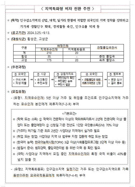 강원특별자치도에서는 지난 1월 법무부의 지역특화형 비자 사업 공모에 횡성군과 고성군이 선정되었으며, 지역우수인재 210명(횡성 35, 고성 175), 지역특화동포(고성) 20명을 모집하기 위하여, 강원특별자치도 지역특화형 비자 전환 추천을 3월 25일 공고할 예정이다.