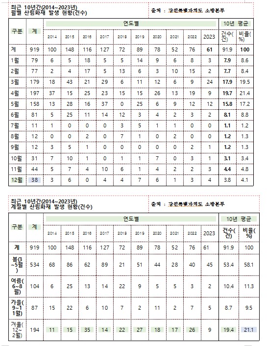 또한 박위원장은 “강원특별자치도 소방본부의 최근 10년간 산불발생 현황자료에 의하면, 봄철(3월~5월)에 전체 산불의 58.1%(919건 중 534건)가 집중되어 발생하고 있다”고 지적하면서 집행부에 선제적인 예방대책 마련을 촉구하였다.