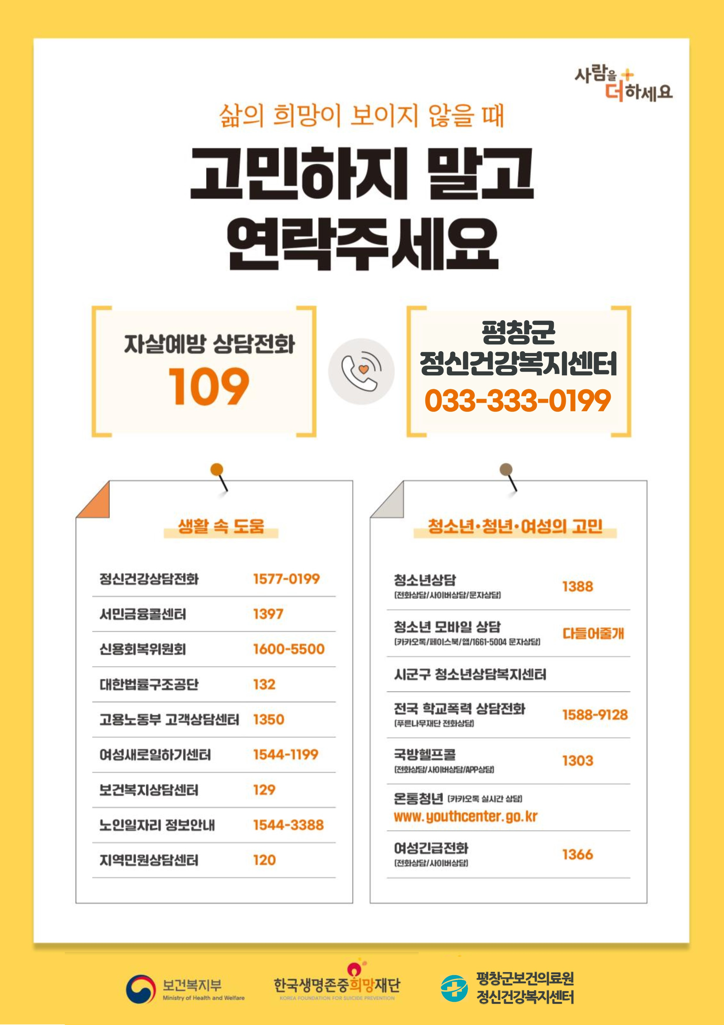 박건희 보건의료원장은“3~5월이 자살률 증가 현상이 나타나는 자살 고위험 시기인 만큼, 평창군민의 정신건강 및 자살예방에 적극 앞장서겠다.”라며 “아울러, 우울감 등 고민으로 도움이 필요한 경우에는 주저하지 말고 평창군 정신건강복지센터(☎033)333-0199,)나 자살예방 상담전화(☎109)로 도움을 요청해 달라.”라고 밝혔다.