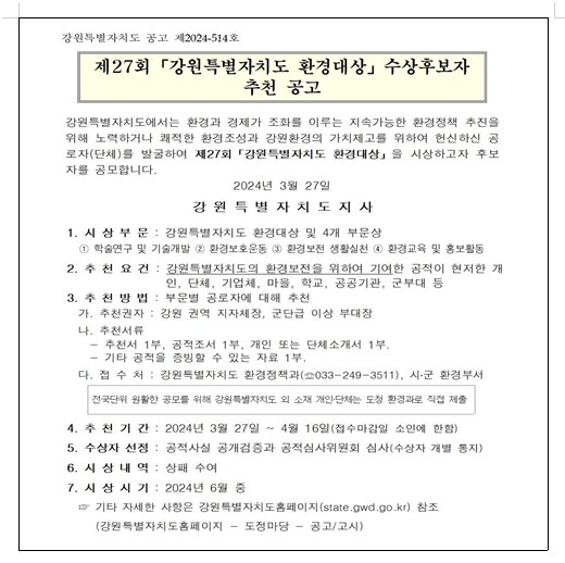 제27회 강원특별자치도 환경대상 수상후보자 공모