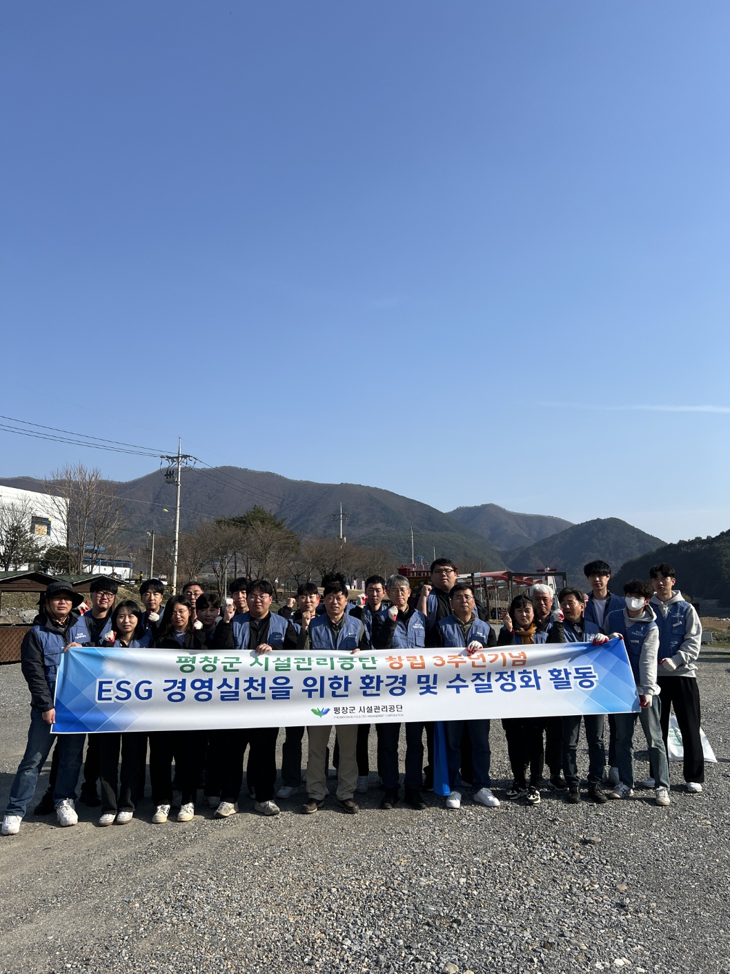평창군 시설관리공단은 창립 3주년을 맞이하여 환경 및 수질정화 활동을 펼쳤다. 이번 행사는 ESG(환경·사회·지배구조) 경영 실천을 위한 사회공헌 활동의 일환으로 공단 직원들은 평창강을 따라 쓰레기를 줍는 플로깅을 하고, EM흙공을 이용하여 깨끗한 하천 만들기에 동참했다.
