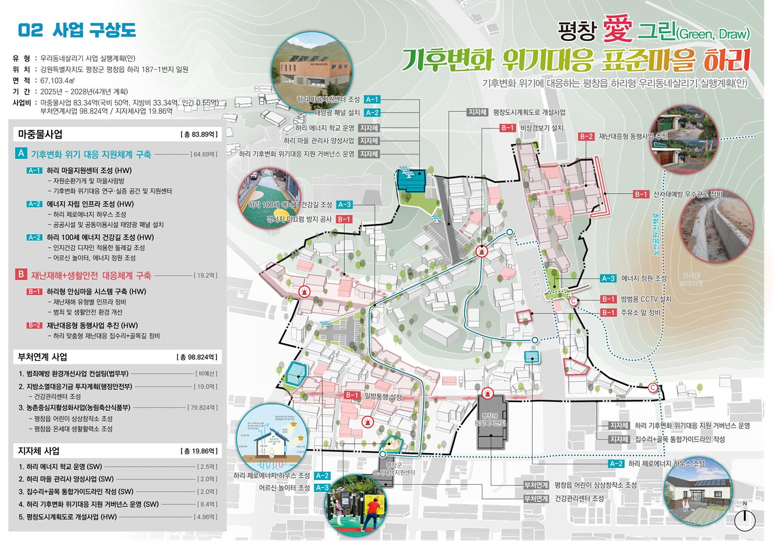 군은 평창읍 하리 187-1번지 일원(약 67,103.4㎡)을 사업대상지로 하며, 기후변화와 재난재해 대응에 대한 내용을 사업에 담았다. 아울러, 사업대상지 내 노후도가 심한 95호의 과반수 이상인 56호의 집수리동의를 받아 재난대응형 동행사업을 추진하고자 한다.