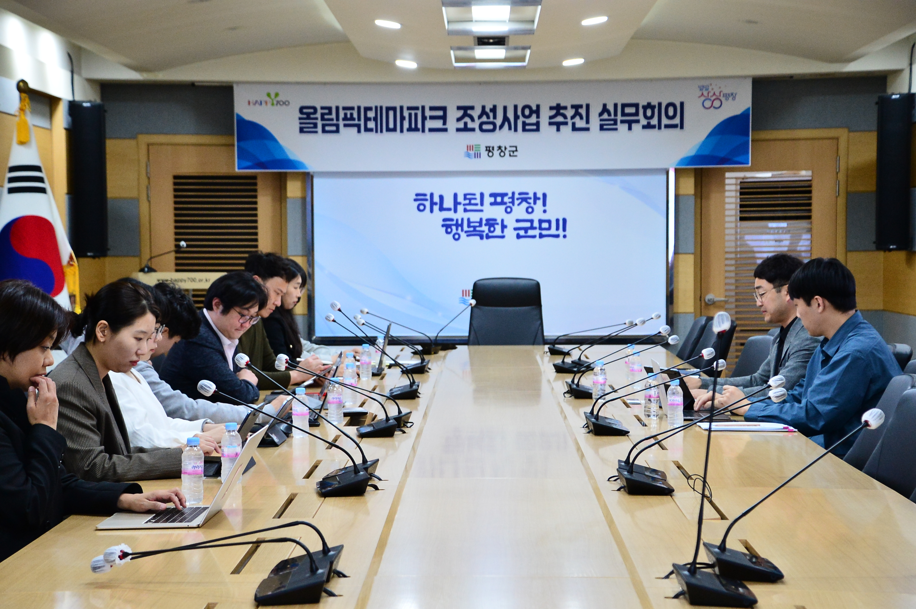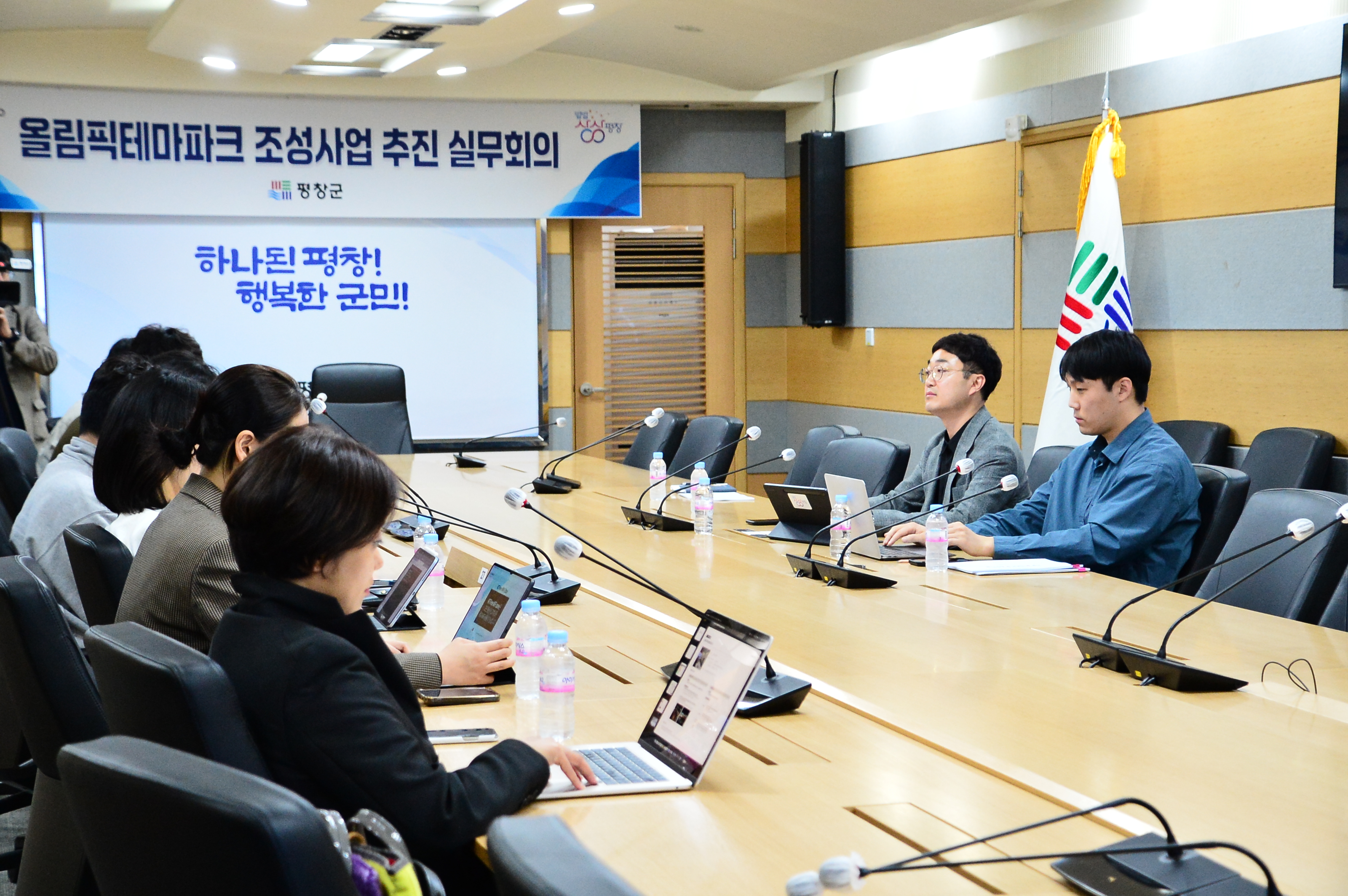 평창군은 4월 26일(금) 평창군청 소회의실에서 올림픽체육과 유산조성팀과 올림픽테마파크 실감콘텐츠 제작 용역 수행업체 ㈜자이언트스텝, ㈜바온이엔아이, ㈜스타네트웍스 등 10여 명이 참석한 가운데 올림픽테마파크 ICT복합문화공간에 설치할 실감콘텐츠 제작에 관한 실무회의를 개최하였다.