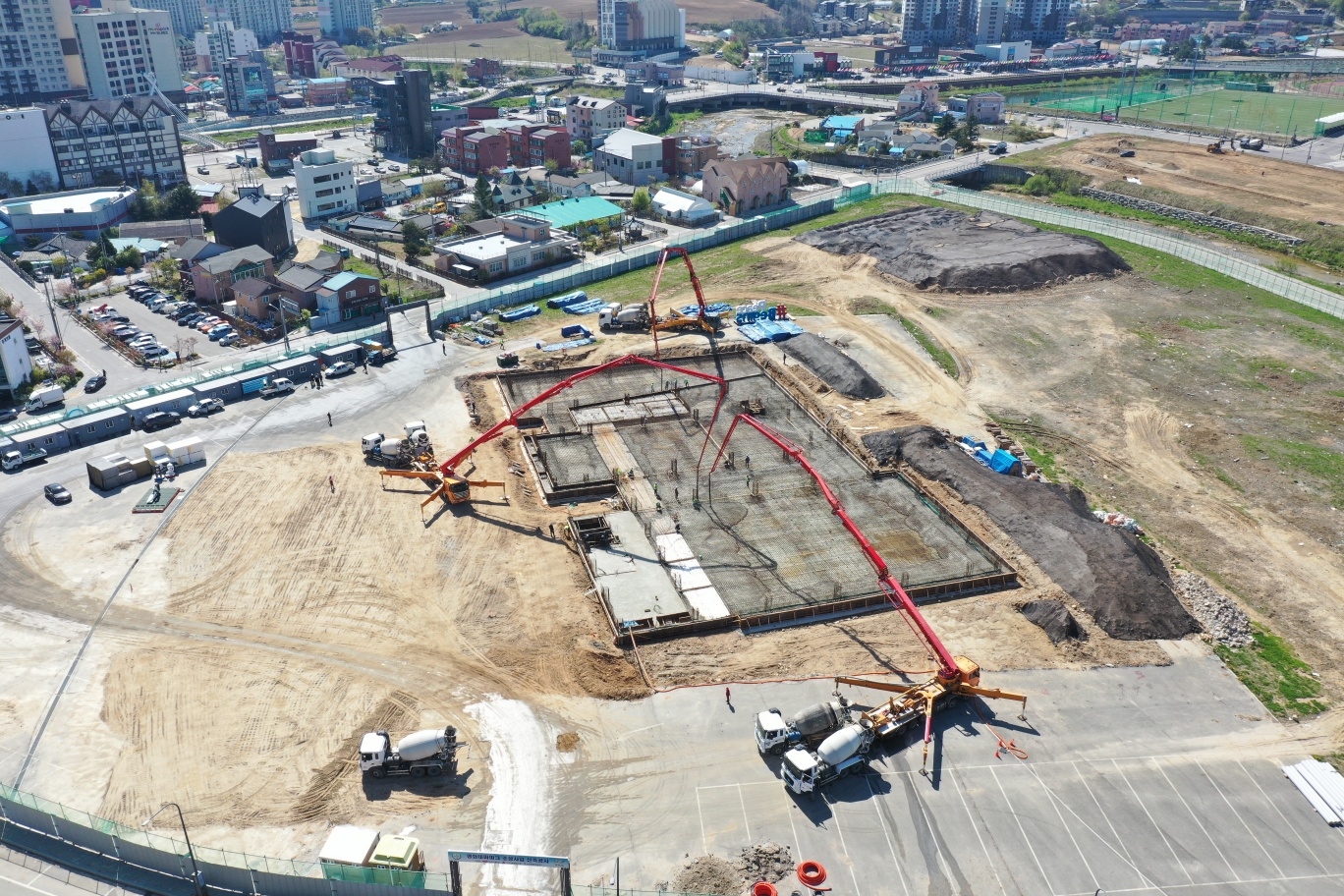 2일 진행한 매트(MAT) 기초 콘크리트는 구조 안전성을 위해 연속 타설로 진행되었으며, 타설량은 2.000㎥로 레미콘트럭 약 330대 분량에 해당하는 규모이다. 평창지역 레미콘 업체 6개사가 물량을 조달했으며 펌프카 3대, 살수차 1대 등의 장비와 30여 명의 인력이 동원됐다.