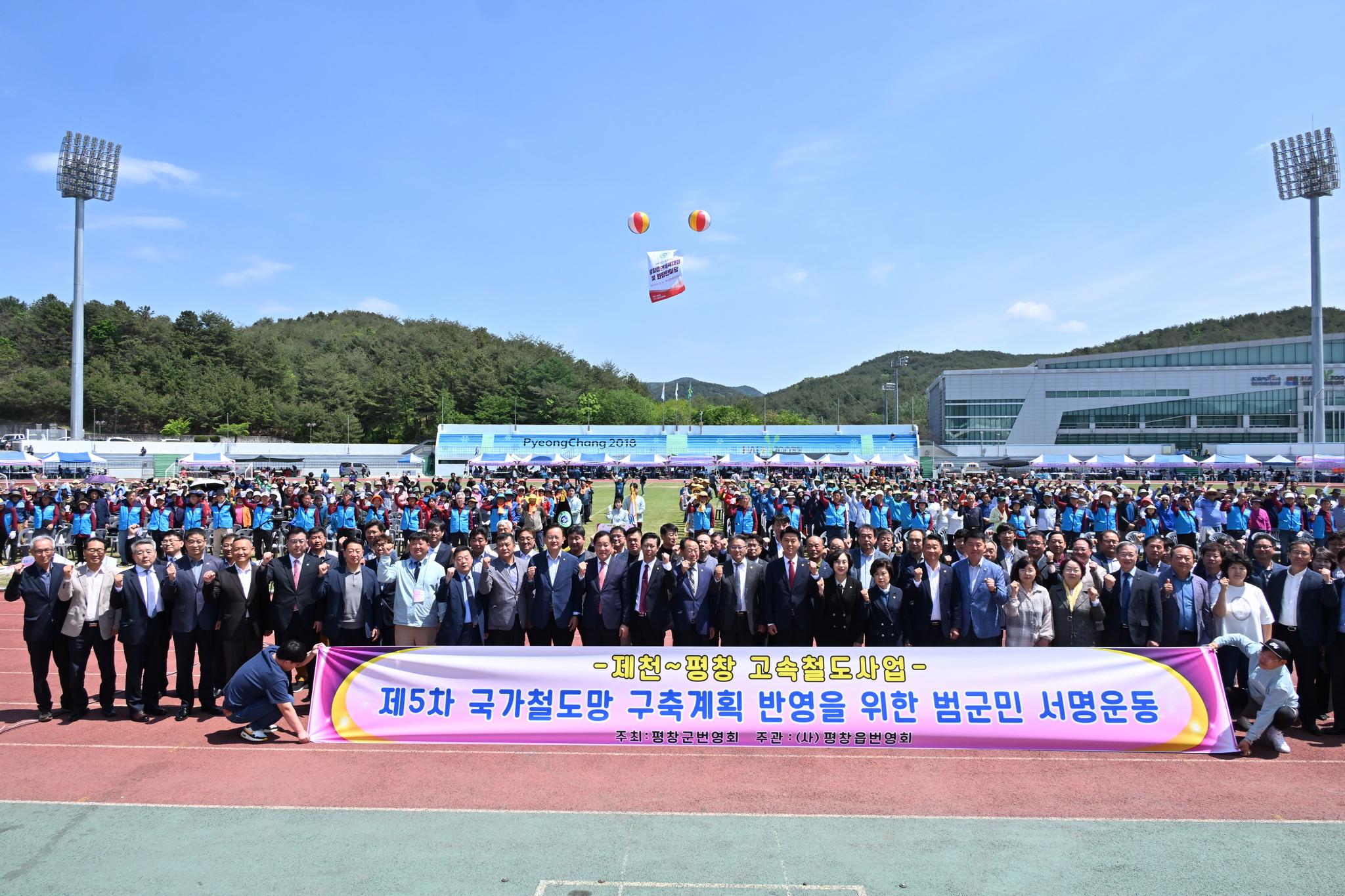 평창군 번영회(회장 장동기)에서는 5월 1일 평창종합운동장에서 열린 제43회 평창읍민 체육대회 행사장에서 제천~평창 고속철도사업 제5차 국가철도망 구축계획 반영을 위한 범군민 서명운동을 전개했다.