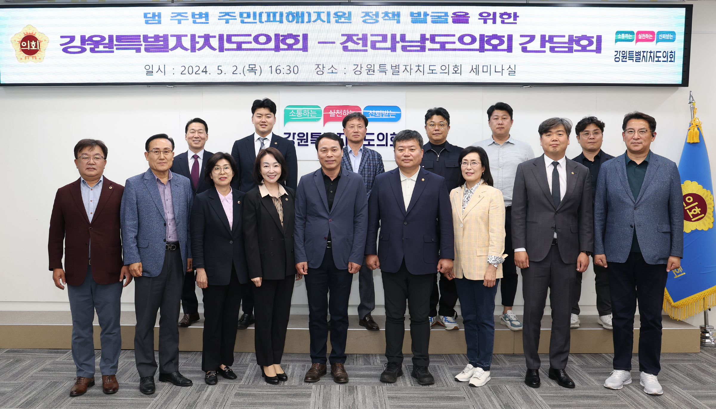 강원특별자치도의회 소양강댐 주변지역 피해지원 연구회(회장 박기영의원, 간사 양숙희의원)는 5월 2일 오후4시경 도의회 세미나실에서 전남도의회「댐환경특별위원회」(위원장 정영균의원)와 간담회를 개최하였다.