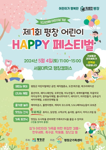 제1회 평창 어린이 행복 페스티벌이 지난 4일 서울대 평창캠퍼스 중앙광장에서 열렸다. 이날 행사에서는 지역 어린이들로 구성된 평창 어린이 발레단의 공연과 어린이집 원생들의 애국가, 어린이날 노래 제창이 있었다. 부대행사로는 매직 벌룬쇼, 도전 퀴즈왕 등 무대 공연이 다채롭게 펼쳐졌다. 지역 13개 기관·단체가 마련한 부스에서는 에어바운스, 룰렛 이벤트 등 놀거리와 상추 모종 심기, 소방 안전 체험, 창의놀이, 전통생활놀이, 컵케이크와 비누 만들기 등 체험행사도 열렸다.