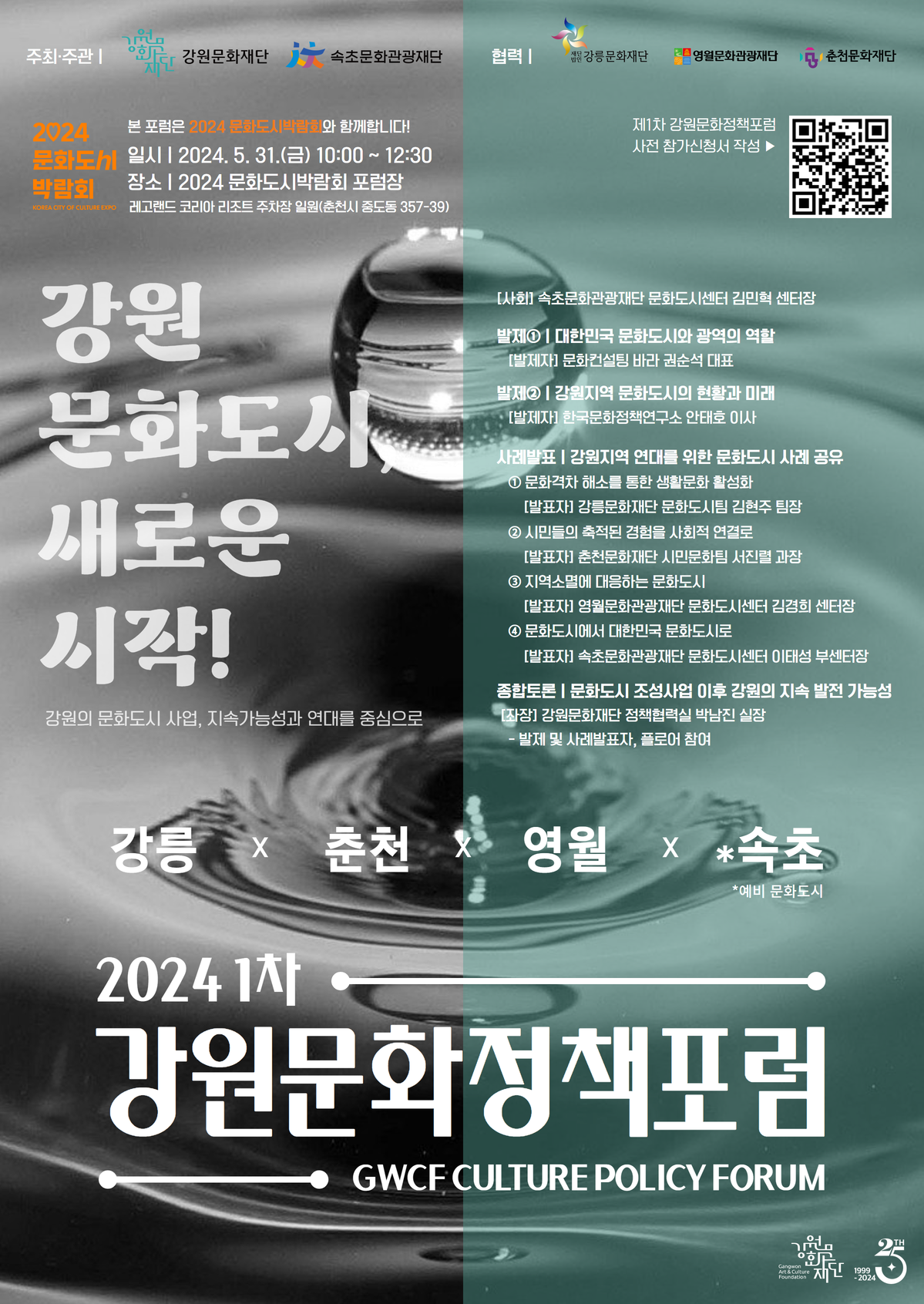 강원문화정책 발굴을 위하여 올해 새롭게 기획된, <2024 강원문화정책포럼>은 ‘도내 기초문화재단과 협력’하에 총 3회 포럼으로 진행될 예정이다. 그 첫 번째로 속초문화관광재단과 공동 주최·주관하는‘제1차 포럼 <강원 문화도시, 새로운 시작!>’을 오는 5.31(금) 오전 10시부터, 2024 문화도시박람회 포럼장(레고랜드 코리아 리조트 주차장 일원)에서 개최한다.