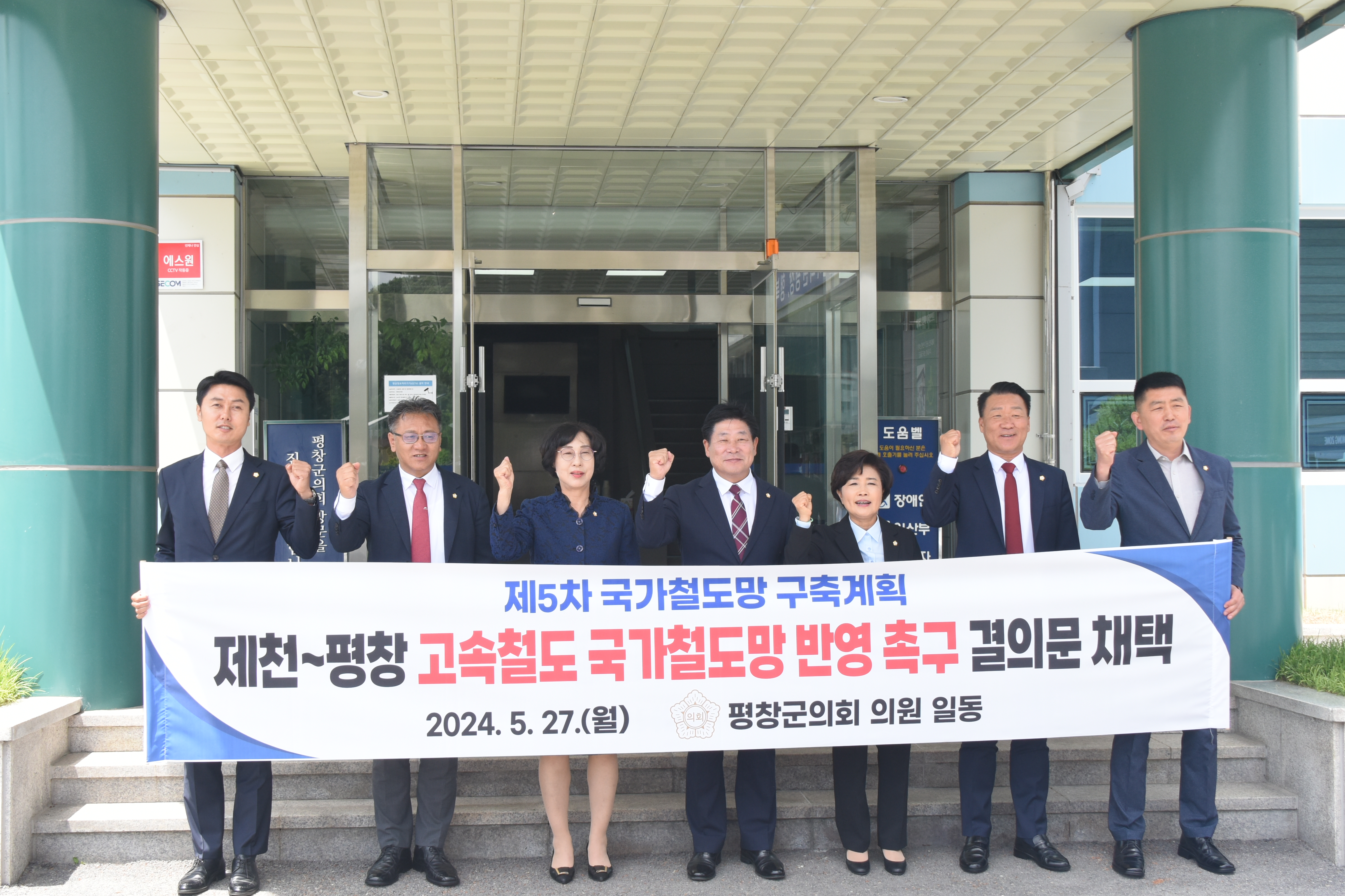 평창군의회(의장 심현정)는 5. 27.(월) 11시 제294회 평창군의회 임시회 제2차 본회의를 개의하여, 평창군의회 의원 전원이 공동발의한 ‘제천~평창 고속철도 국가철도망 반영 촉구 결의문 채택의 건’을 의결하고 결의문을 발표했다.